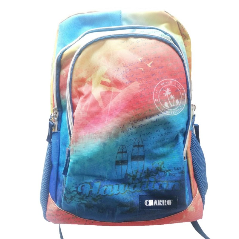 Mochila Charro Surf Festival. Asa superior. 2 Bolsillos delanteros con cremallera. Refuerzo espalda. Bolsillos laterales. Medidas: 45 x 32 x 16cm.