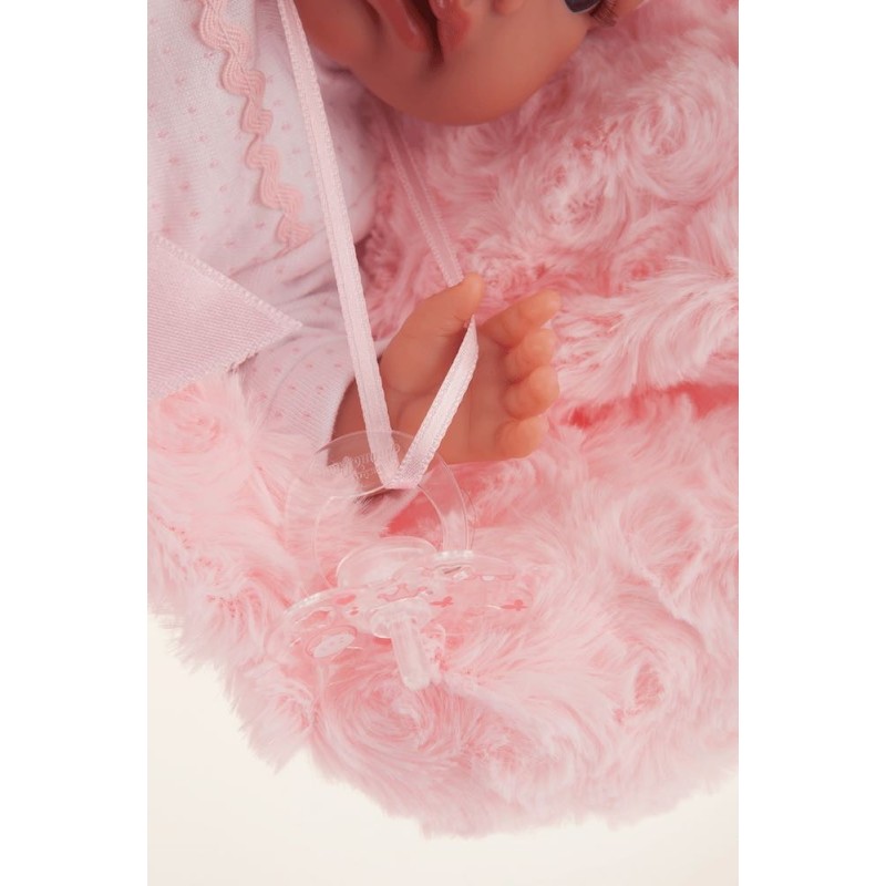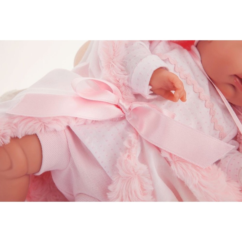 Esta recién nacida descansa envuelta en su arrullo. Mide 34 cm. Tiene extremidades de vinilo y cuerpo blandito de tela. Balbucea al presionarle la barriguita. Está vestida con un conjunto rosa de pantalón corto con patucos y gorro a juego. Articulaciones: cabeza, hombros y piernas. Ojos azules. Presentado en caja de regalo. Pilas incluidas. Las muñecas ANTONIO JUAN están fabricadas íntegramente en España de manera única y artesanal, cuidando hasta el más mínimo detalle. Te parecerá un bebé auténtico con expresiones casi reales. No recomendado a menores de 3 años. Ref: 7030.