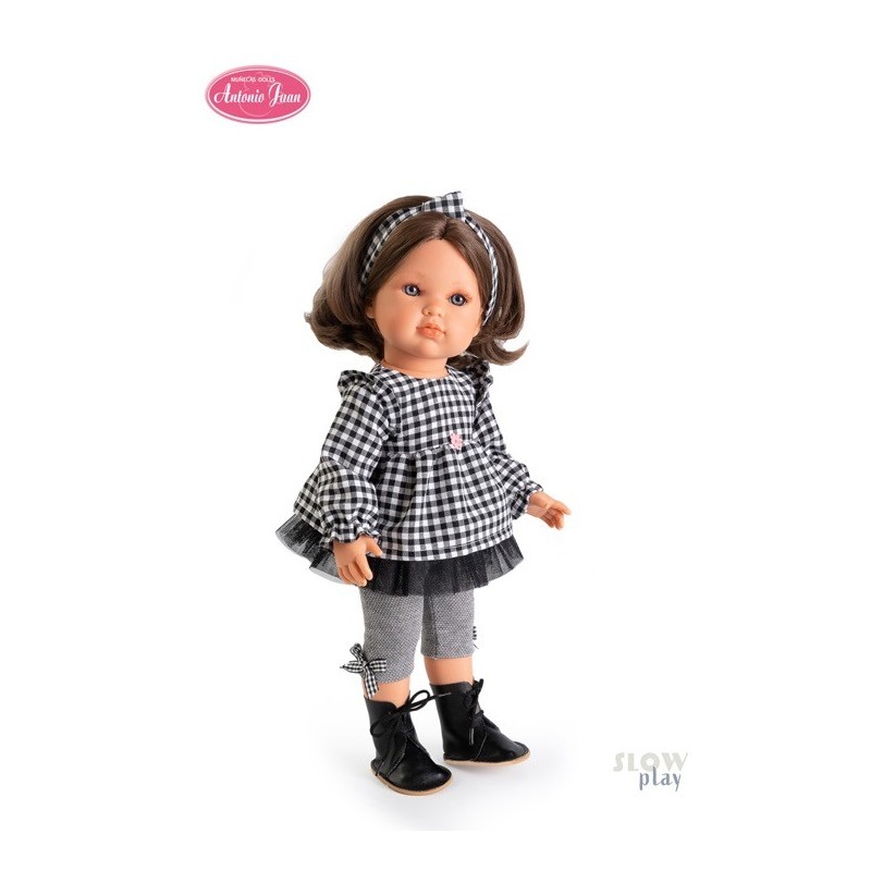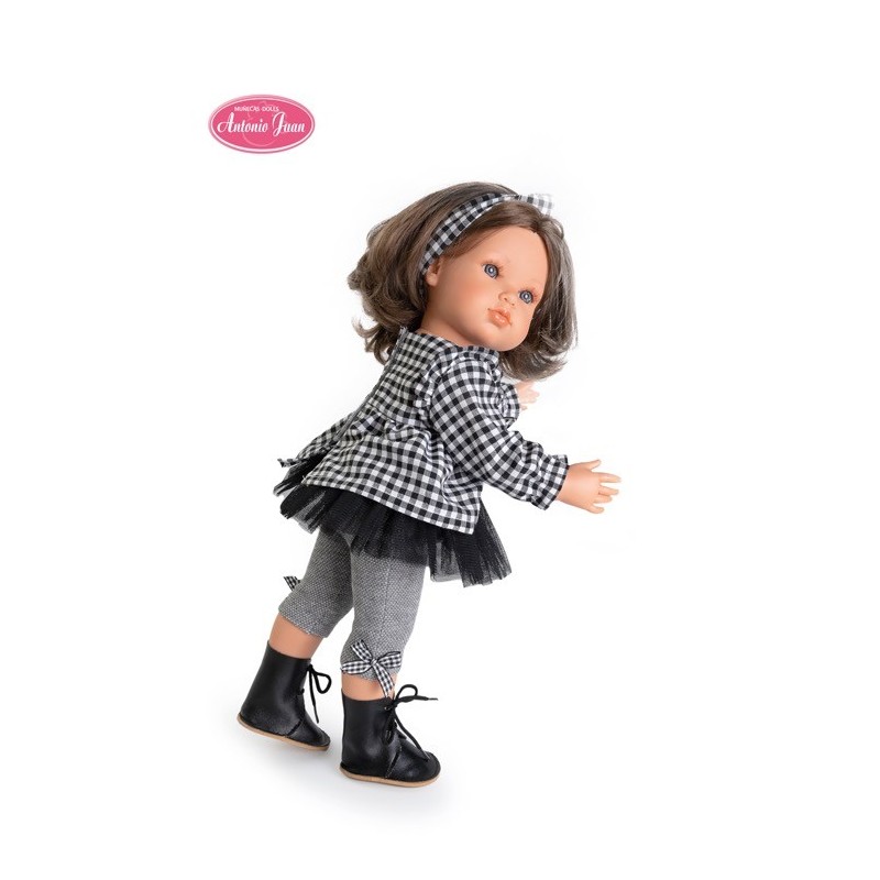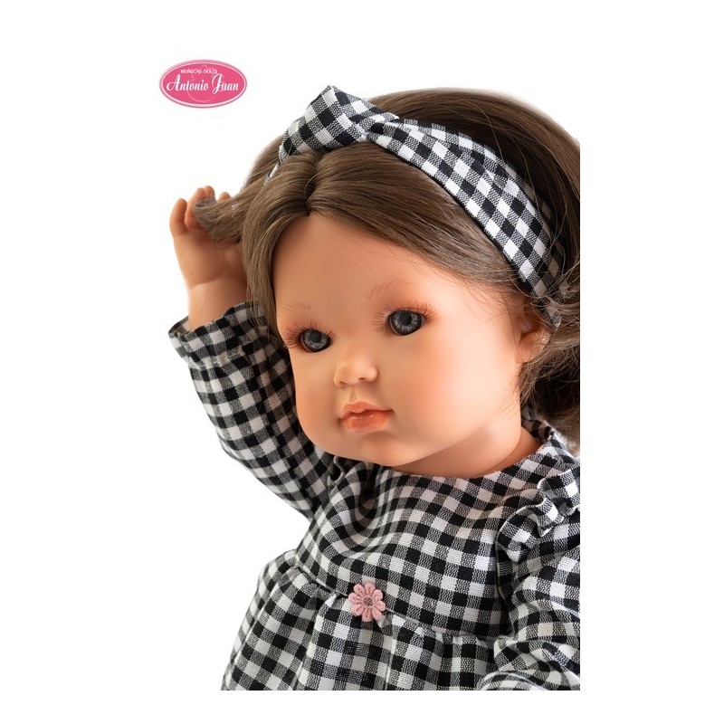 ANTONIO JUAN 28224, Bella Va de Compras CUERPO DE VINILO MUÑECA MANIQUÍ 45 cm. Peso muñeca: 835 gr Bella es esa primera amiga y confidente con la que disfrutar creciendo. Su tamaño y libertad de movimientos hacen que sea muy manejable para los niños y las niñas durante el juego. Bella está preparada para ir contigo de shoping, por eso lleva un conjunto de falda y camisa a la moda, con cuadritos a juego con la diadema. a Bella no le falta detalle. Mide 45 cm y pesa 835 gr. Bella puede mover su cabecita gracias al giro de su cuello. Es una muñeca maniquí de Muñecas Antonio Juan a la que le encantará jugar contigo.