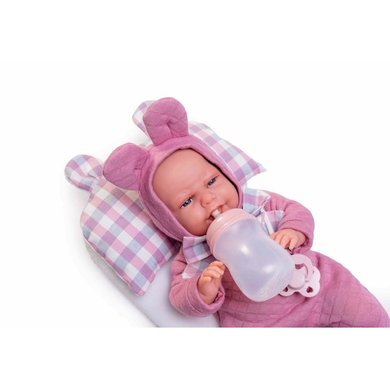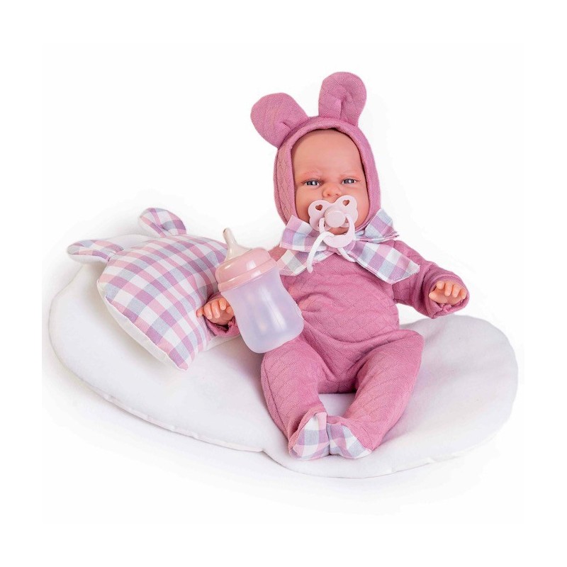 AJ 70355, 34cm, Recién Nacida Baby Carla orejitas con cojín-cuna. C. tela, mecanismo. Tamaño: 34 cm Peso muñeca: 550 gr Tipo de cuerpo: Cuerpo de tela Mecanismo: Voz Edad recomendada: +3 años Blandito y de tacto especial, con cuerpo de tela y extremidades de suave vinilo, es un pequeño bebé fácil de manejar en el juego. Si le aprietas su barriguita balbucea para que disfrutes escuchando sus primeros sonidos y ampliar las posibilidades de juego. Baby Clara palabritas lleva un pijama de tela acolchada con un gorro con orejitas. Cuando está cansado se tumba en su camita a tomar su biberón sobre su bonito cojín. Mide 33 cm. y pesa 550 gr. Baby Toneta, de Muñecas Antonio Juan está esperando poder jugar contigo y que la lleves a pasear con su mochila. Incluye: Pijama Cojín camita Chupete con cinta Biberón