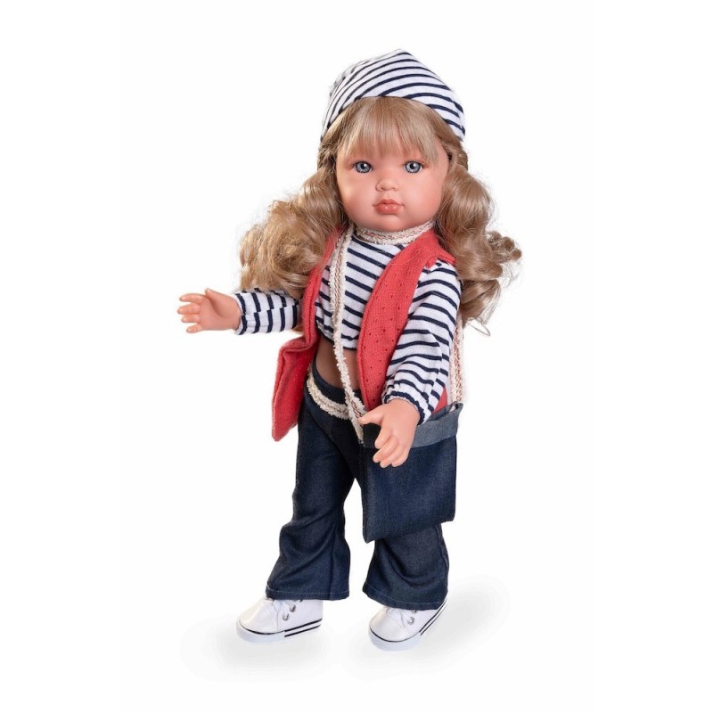 Bella es esa primera amiga y confidente con la que disfrutar creciendo. Su tamaño y libertad de movimientos hacen que sea muy manejable para los niños y las niñas durante el juego. A Bella le gusta salir a pasear. Su ropa y complementos siempre están a la últtima. Siempre a la moda siguiendo las últimas tendencias, con su chaleco y su bolso, no le alta detalle. Su pañuelo en la cabeza a juego con su camiseta. ¿Has visto su bonito pelo? A Bella no le falta detalle. Mide 45 cm y pesa 920 gr. Bella puede mover su cabecita gracias al giro de su cuello. Es una muñeca maniquí de Muñecas Antonio Juan a la que le encantará jugar contigo. Tamaño: 45 cm Peso muñeca: 920 gr Tipo de cuerpo: Cuerpo vinilo Muñeca sin mecanismo. Cuerpo no sexuado. Edad recomendada: +3 años