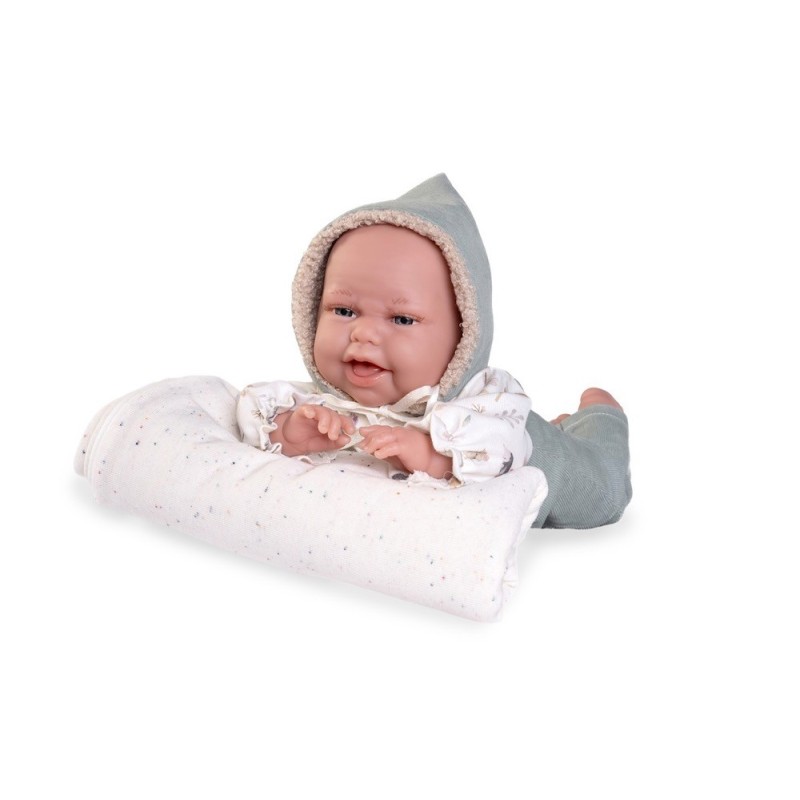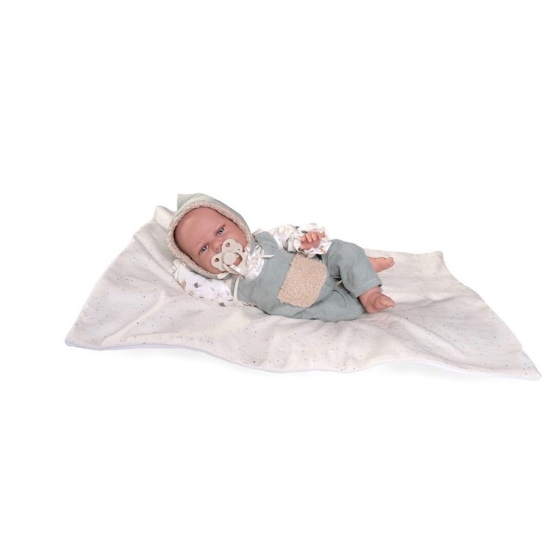 Edad recomendada: +3 años. Medidas: 34 cm. Cuerpo con relleno especial de bolitas. Incluye: Capota, camisa, pelele, manta y chupete. Esta adorable recién nacida de 34 cm es puro amor. Esta muñeca tiene un cuerpo con relleno especial, que adopta posturas como un bebé de verdad. Su carita dulce y expresiva invita a abrazarla sin parar. Esta recomendada para niños a partir de 3 años. Es una bebé muy coqueta, que viste con un ideal peto de pana y borreguito con una capucha para resguardarse del frio. ¡No nos puede gustar más!