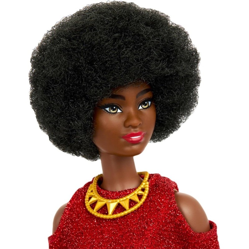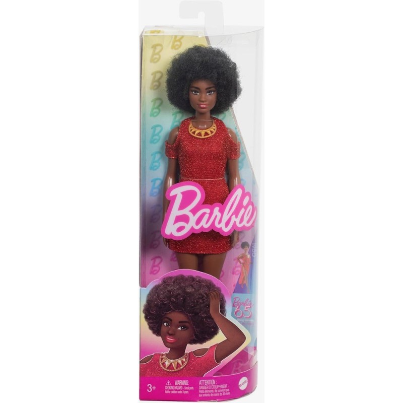 Esta muñeca Barbie celebra 65 años de estilo único añadiendo toques modernos a looks icónicos, además de pequeños detalles llenos de personalidad. Esta muñeca Barbie Fashionistas está inspirada en el estilo conmemorativo de la muñeca en 1980, y lleva un vestido rojo de punto con aberturas en los hombros. Unas sandalias rojas de tacón y un collar dorado atrevido le dan al conjunto un aire clásico y actual al mismo tiempo. La muñeca Barbie lleva su pelo negro peinado al natural, por lo que está perfecta para cualquier ocasión.