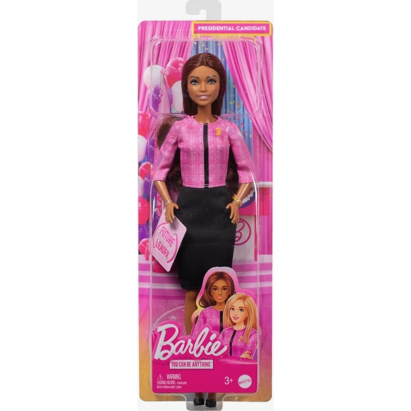 InspirBarbie a los jóvenes líderes con la muñeca Future Leader. La muñeca Barbie está lista para tomar la iniciativa con un blazer rosa y un aspecto de falda o pantalón, combinado con dos pulseras doradas y pin "B". Los niños pueden jugar un día en el sendero de campaña de la muñeca Barbie con la calcomanía portátil de tamaño infantil para una diversión inmersiva. La muñeca Future Leader Barbie está llena de posibilidades de contar historias para jugar al liderazgo femenino.