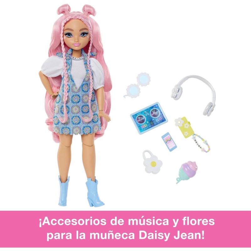 La muñeca Barbie Daisy Jean de Barbie Dream Besties te enseña que todo es posible cuando compartes tu talento con todo el mundo. Daisy Jean sueña con tener su propia discográfica y actuar en el festival de música más importante del mundo; Viene con accesorios temáticos como una mesa de mezclas, unos auriculares, un teléfono, algodón de azúcar, un collar, una funda para el móvil y un bolso con temática de margaritas. La muñeca está articulada y lleva ropa intercambiable, como un vestido de croché metalizado sobre una camiseta blanca de mangas abombadas; En los pies lleva unas botas vaqueras azules.