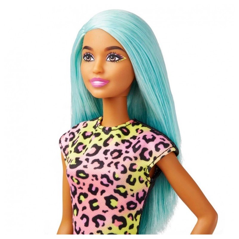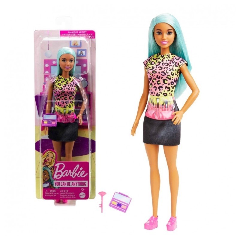La muñeca Barbie Maquilladora está lista para dar a los clientes un nuevo look con un delantal estampado y accesorios de maquillaje. La muñeca Barbie Maquilladora, que luce un look fabuloso con su pelo azul, una blusa con estampado de leopardo de colores y zapatos de plataforma rosas, inspira a los más pequeños a partir de 3 años a explorar sus sueños. La muñeca no puede tenerse en pie por sí sola. Los colores y la decoración pueden variar.