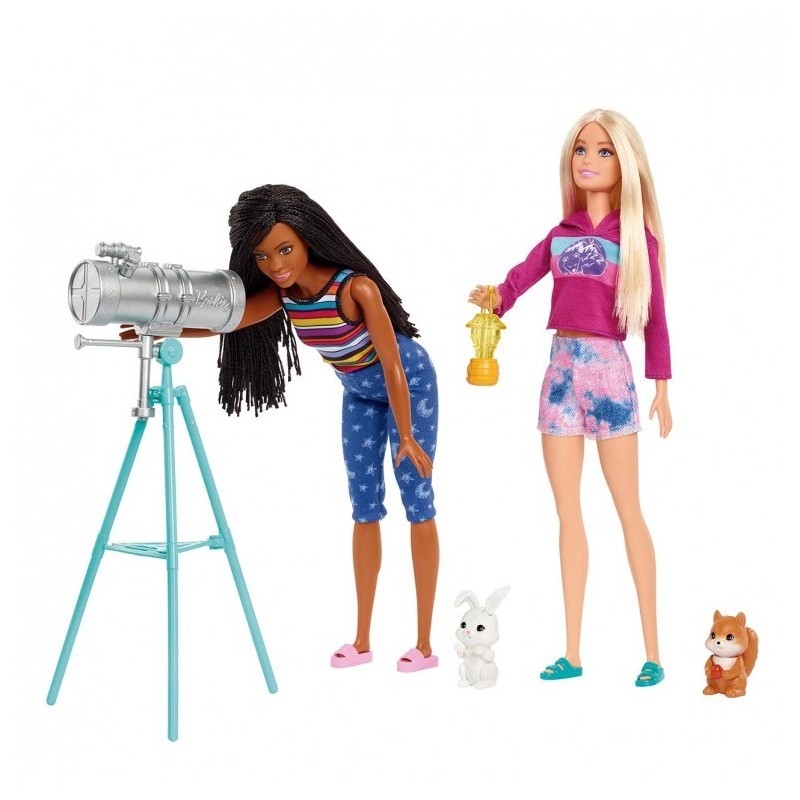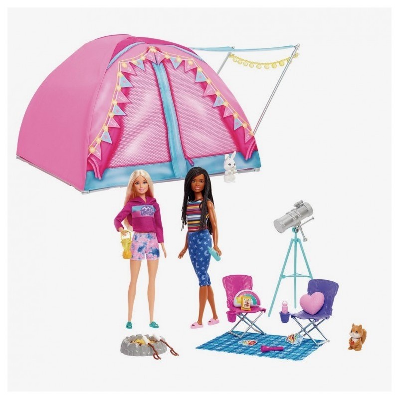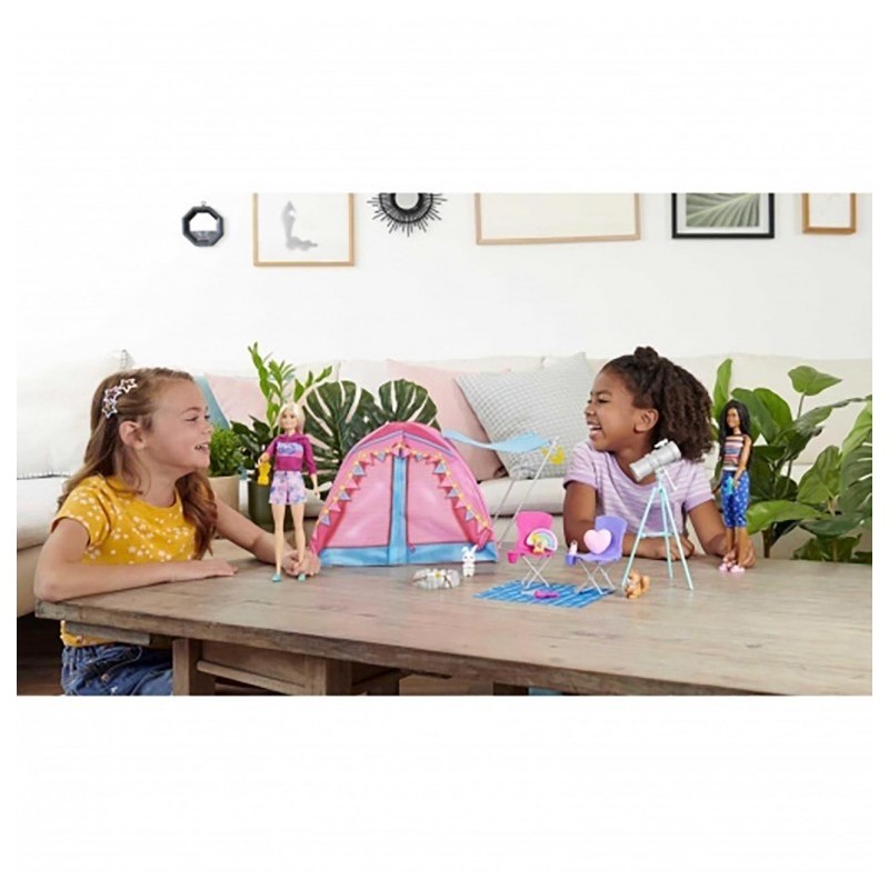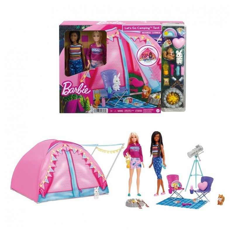 Sal al aire libre con este conjunto Barbie It Takes Two que incluye la muñeca Barbie 'Malibu' Roberts, la muñeca Barbie 'Brooklyn' Roberts, su propia tienda de campaña y un montón de accesorios temáticos. En esta gran tienda de campaña de tela, decorada con un toldo y una tira de luces, caben cuatro muñecas. Las niñas pueden colocar la tienda y contar historias de acampada a la luz de la luna con las sillas plegables, el telescopio, la hoguera, dos palitos para tostar nubes, un juego de cartas y mucho más. Incluso es posible que dos animalitos del bosque les hagan una visita. Con estas dos muñecas que llevan unos adorables conjuntos de acampada y diversos accesorios, las niñas a partir de 3 años pueden imaginar infinitas aventuras al aire libre. Las muñecas no pueden tenerse en pie por sí solas. Los colores y la decoración pueden variar.