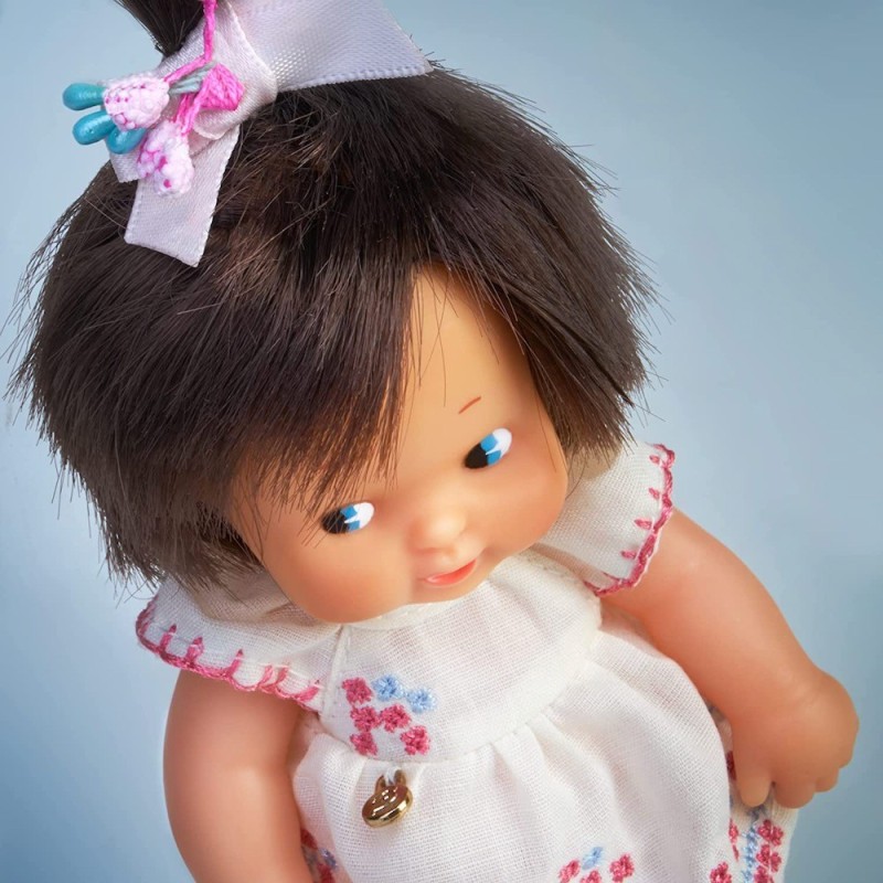 Barriguitas Primavera Morena Pelo Liso. Camisola beige.