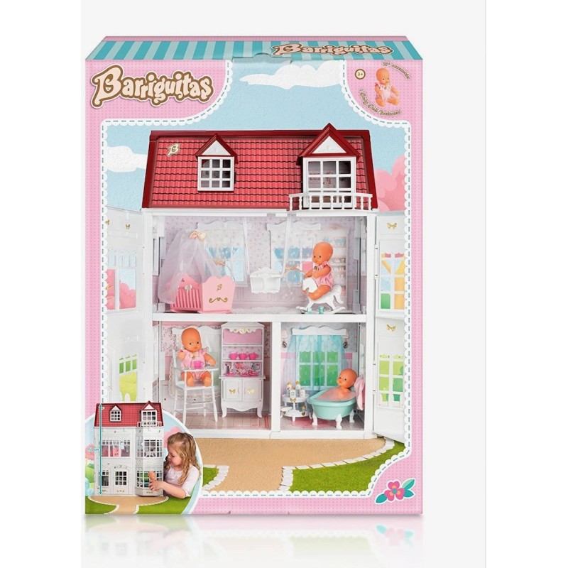 La Casa Barriguitas (700017220) es la primera casita de muñecas para los bebés Barriguitas. Un playset que cuenta con un montón de detalles súper realistas y accesorios, para jugar con tus muñecos Barriguitas ¡como si fueran bebés de verdad! Esta preciosa casa de juguete tiene una increíble estética victoriana que le da ese toque clásico que encanta a las mamás. La casa está hecha con materiales de primera calidad, cuidando todos los detalles y accesorios que incluye. Hay tres habitaciones diferentes con muebles y accesorios incluidos para decorarla y jugar con ellos. En la parte de arriba, se encuentra la habitación del bebé, con cuna con dosel, un columpio, un caballito balancín, la alfombra, cortinas y diferentes juguetes para tu Barriguitas. En la parte de abajo, nos encontramos dos estancias: la cocina, con un mueble para la vajilla y una trona; y el baño, que cuenta con una bañera, una mesita para los accesorios de baño, toalla y cortina. La casa se puede abrir para jugar, o se puede mantener cerrada y utilizarla para guardar todos los accesorios en su interior e incluso llevarla a todos lados con el asa que tiene en la parte superior. Incluye más de 10 accesorios y muebles para todas las habitaciones de la casa. Incluye una exclusiva bebé Barriguitas con un precioso vestido de punto rosa. Un juguete pensado para completar tu colección Barriguitas. Indicado tanto para niñas y niños a partir de los 3 años de edad, como para coleccionistas y adultos nostálgicos de esta marca de toda la vida.