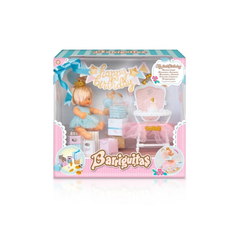 Barriguitas Mi Primer Cumpleaños incluye la característica trona de primer cumple con detalles dorados, que además es un balancín. Incluye productos sorpresa escondidos en los regalos por abrir, además de una tarta de primer cumple. Viene con vestido de tul azul y una corona de primer cumple dorados. Edad recomendada: +2 años.