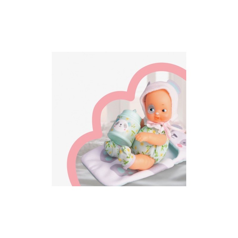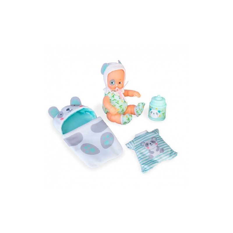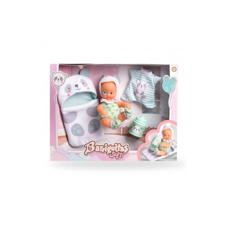 Una nueva Barriguita Soft vestida de osito panda. Este adorable bebé de cuerpo blandito tiene la cara decorada y lleva un gorrito con orejas de oso panda de quita y pon. Además, viste un body estampado de bambú y calcetines a juego. Entre sus accesorios incluye un pijama de rayas, un saquito de dormir con la misma temática de oso panda que el bebé y un biberón. Barriguitas Soft Trousseau es compatible con todas las Barriguitas de tu colección.