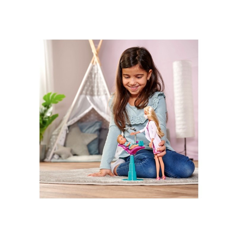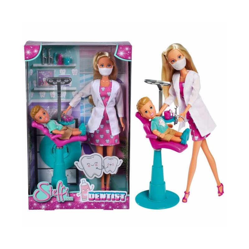A Steffi le encanta su trabajo como dentista y cuida de sus pequeños pacientes cada día. Esta vez, el pequeño Timmy se ha sentado en la silla del dentista. Para garantizar una higiene suficiente, Steffi también lleva una mascarilla. El set incluye la muñeca Steffi de 29 cm de altura con bata de médico, Timmy de 12 cm de altura, un sillón de dentista y otros accesorios a juego. Edad recomendada: +3 años.