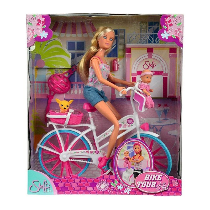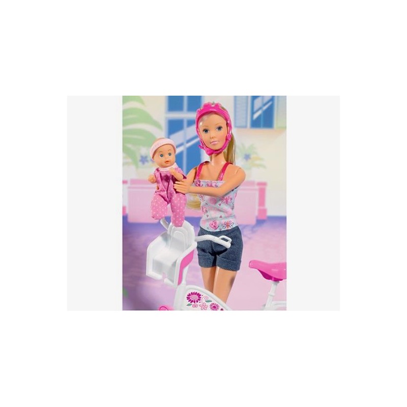 A Steffi le gusta mucho salir a pasaer con su bicicleta. Steffi tiene en su bicibleta una silla para su bebé y cesta para su perrito. A partir de 3 años