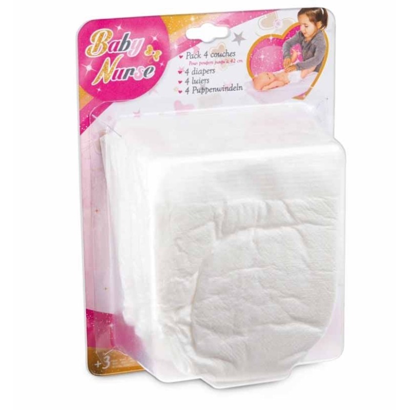 Blíster de 4 pañales para muñecas de hasta 42 cm. Edad recomendada: a partir de 3 años.