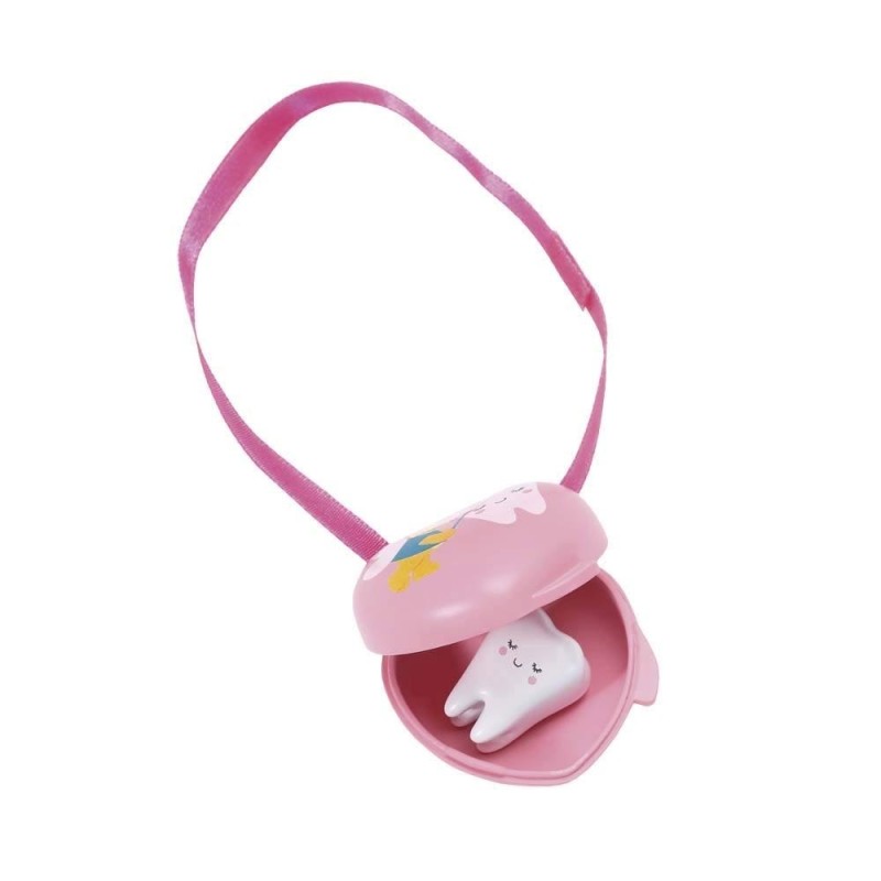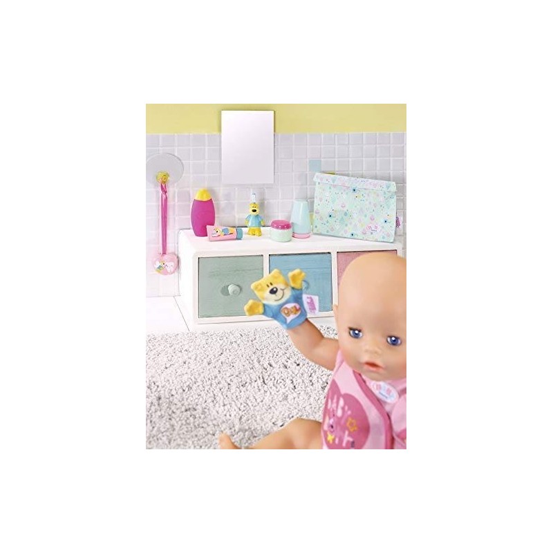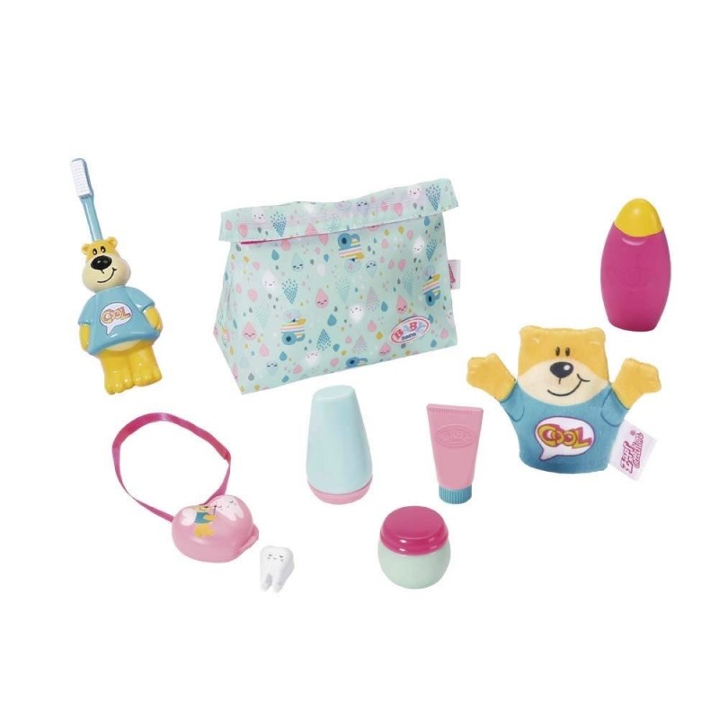 Es hora de lavarse las manos, limpiarse el bigotito de leche y volver rápidamente al juego con el Set de Baño con Accesorios de BABY born. El cepillo de dientes del oso Bruno y el tubo de pasta a juego hacen que lavarse los dientes sea mucho más divertido. Cuando los dientes de leche tambalean y comienzan a caerse, puedes guardarlos en su cajita. ¡Sorpresa! ¡La cajita ya viene con un diente en su interior!. Una manopla de oso, un frasco de crema, un bote de gel y otro para los polvos de talco completan este completo set. ¡Guárdalo todo dentro del colorido neceser y llévalo contigo a cualquier parte! Edad recomendada: +3 años.