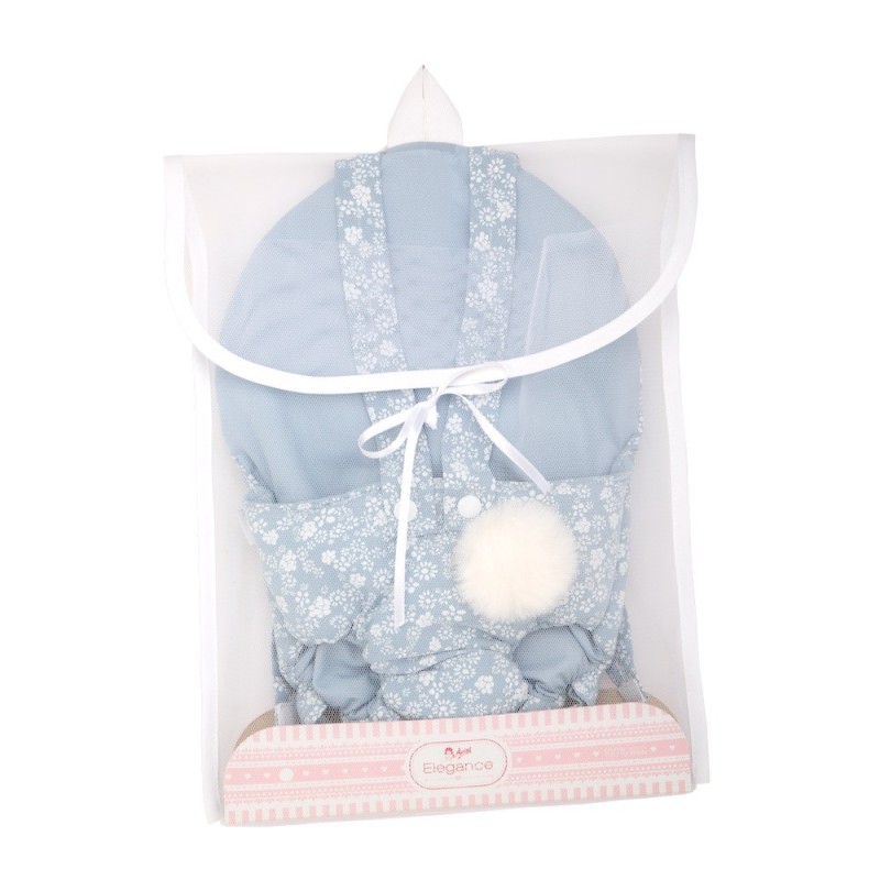 Portabebé azul con estampado de florecitas blancas y pompón blanco para muñecos de 40-45 cm. ¡A los peques de la casa les encantará ir acompañado de su muñeca en este bonito portabebés! Es muy cómodo y ligero. Además, se puede ajustar para adaptarlo a la altura de los peques. Los tejidos utilizados para la elaboración de este portabebés en tonos azul y blanco son de alta calidad.