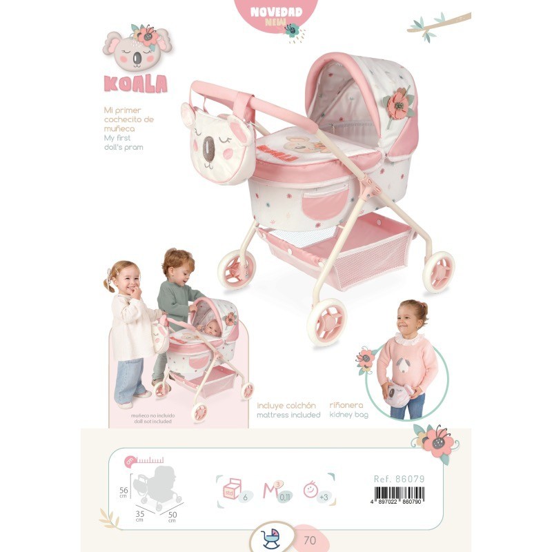 Dimensiones aproximadas del carro de muñecas: 56 cm de alto hasta el manillar, 35 cm de ancho y 50 cm de largo. Dimensiones aproximadas del interior del capazo: 41 cm de largo y 24 cm de ancho. Artículo para muñecas y muñecos bebés de hasta 42 cm de largo. Este genial carro tiene el tamaño ideal para los peques, para que puedan pasear por toda la casa y zonas al aire libre habilitadas. Incluye un bolsito a juego, donde guardar la merienda del bebé y otros accesorios para su cuidado. Carro de muñecas de color blanco y rosa con estampado especial de la linea Koala, bandeja inferior de tela portaobjetos, ruedas con cubierta de foam silencioso, manillar acolchado, capazo rígido, capota extensible, bolso para el carro a juego y más detalles de lujo.