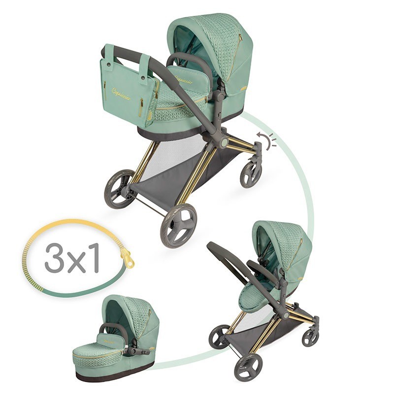Edad recomendada: 3 años o más. Medidas aproximadas del carro de muñecas abierto: 79 cm de alto (73 cm hasta el manillar), 38 cm de ancho y 65 cm de largo. Medidas aproximadas del capazo: 49 cm de largo y 23 cm de ancho. Para muñecas de hasta 50 cm. Consigue este precioso y elegante carrito de juguete, descubre la colección más innovadora de tu marca preferida, de la mano de este espectacular Carro de Muñecas Capriccio 3x1. Un carro convertible en sillita de paseo, así como en capazo, todo lo que necesitas para disfrutar del genial juego de imitación que tantos beneficios tiene para los peques de la casa. Incluye: 1 carro de muñecas Capriccio de color verde y negro con diseño 3 en 1 convertible en sillita y capazo, estructura plegable, ruedas delanteras giratorias, cinturón de seguridad de estilo arnés, bandeja inferior portaobjetos, tela acolchada y lisa combinada, parte de la estructura cromada, bolso a juego y más detalles de lujo.