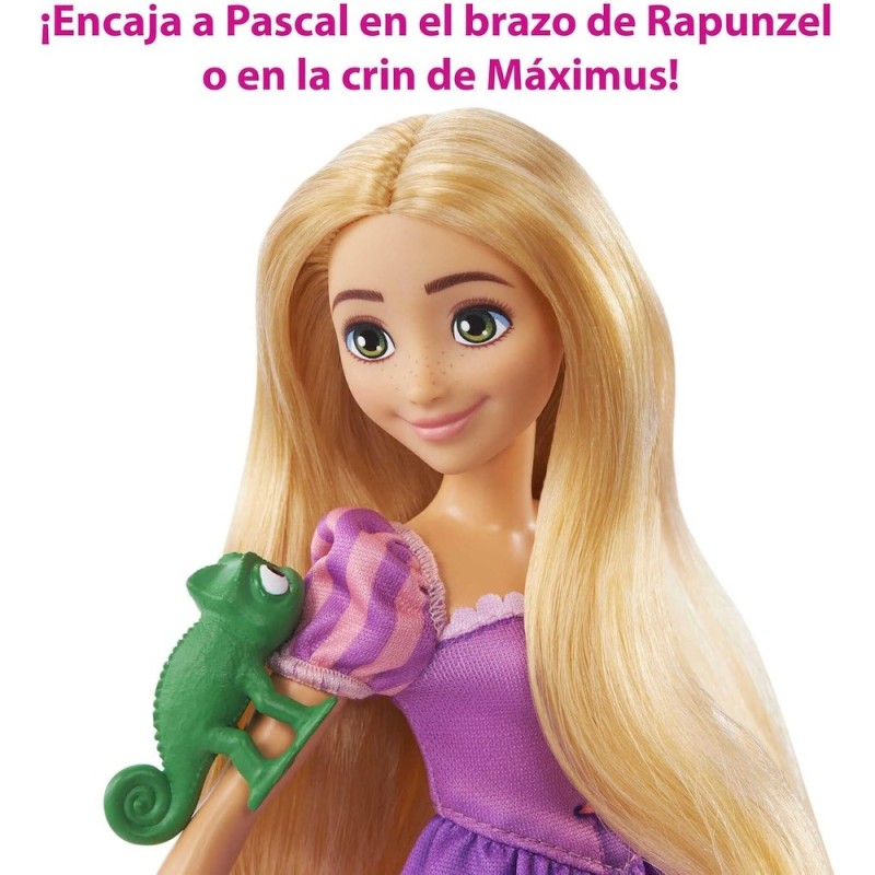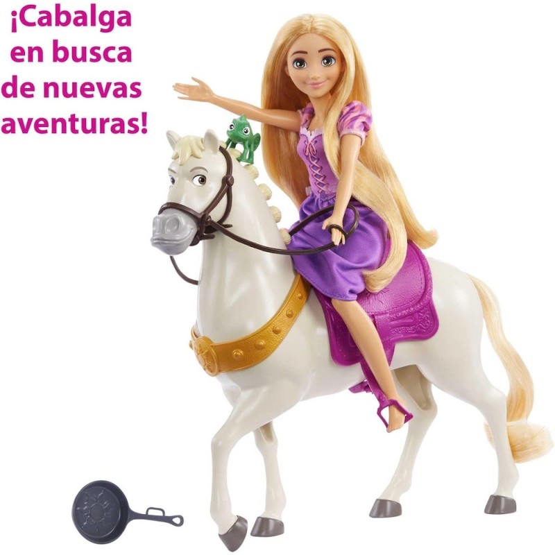 Inspirada en los personajes animados favoritos de los fans de Enredados de Disney, esta muñeca Rapunzel y el caballo Máximus son perfectos para cualquier fan de Enredados Máximus está listo para la aventura con una silla de montar y riendas intercambiables. Las rodillas de Rapunzel se doblan para dar un paseo por el reino montando a Máximus con su característico vestido morado de tela suave. Rapunzel tiene el pelo largo y un cepillo en forma de sartén para que los más pequeños se diviertan cepillándola y peinándola. Incluye una adorable figura de Pascal que se puede enganchar al brazo de Rapunzel o a la crin de Máximus.