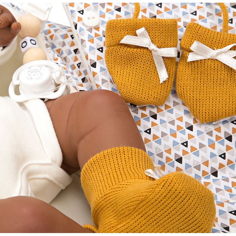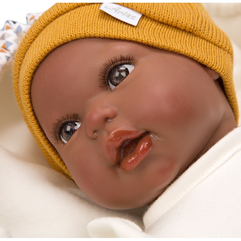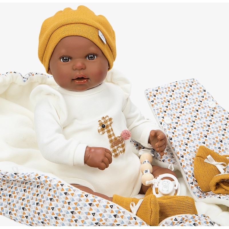 Medidas: 45 cm. Peso: 5.4 kg Cuerpo blando y extremidades de vinyl. Reborn Arias de 45 cm RAPHAEL. Bebé Reborn realista con extremidades de vinyl y cuerpo blando. Vestido con conjunto en blanco y mostaza y saco de dormir diseñado con detalles de triángulos en los mismos tonos. Incluye saco de dormir, chupete, chupetero, pañal, libro de familia y certificado de autenticidad. ¡Raphael siempre está preparado para irse de paseo en su bonito saco de dormir! Este bebé reborn pasará miles de aventuras junto a tu peque, que no dejará ni un minuto de disfrutar. Para la elaboración artesanal de este bebé reborn se ha cuidado al máximo cada detalle. Además, desprende un dulce aroma a vainilla que te encantará. Sus brazos y piernas se componen de vinyl, un material de alta calidad y muy suave, que permite proporcionar detalles muy realistas, como las rojeces de la piel, las venitas o la decoración de las uñas. El cuerpo blando relleno de bolitas aporta estabilidad y peso. Su ropita y saco de dormir a juego en tonos mostaza y blanco se ha confeccionado solo con tejidos de alta calidad. Como accesorios incluye chupete, chupetero, saco de dormir, pañal, libro de familia y certificado de autenticidad.