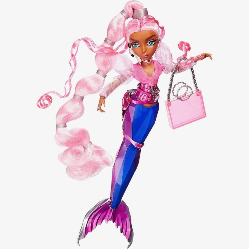 MERMAZE MERMAIDZ Muñeca de Moda Sirena Harmonique. Descubre a Harmonique, una hermosa muñeca sirena con bonitos ojos de cristal, pestañas, maquillaje de fantasía y pelo rosa claro recogido en una cola de caballo con dos rizos fucsias sueltos. Harmonique está lista para actuar con su look de estrella del pop. Lleva una blusa con hombros abullonados, un corpiño de pedrería y un cinturón. Lleva un collar de gargantilla, pendientes, auriculares y un bolso de mano. Cada muñeca Mermaze Mermaidz tiene una cola única que contiene una sorpresa mágica. Sumerge la cola en agua tibia para que se produzca el cambio de color. La cola de Harmonique cambia de morado/rosa a plateado. Edad recomendada: +4 años.