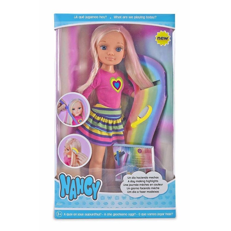 A Nancy le encantan las mechas igual que a ti. Esta Nancy con el pelo súper largo es perfecta para peinarle y decorar su pelo con las tizas de colores incluidas, para poder hacerle mechas en el pelo dando un efecto arcoíris. Ésta vez no solo podrá peinar y pintar el pelo de Nancy sino que la niña también lo puede aplicar sobre su propio pelo. Incluye tizas de diferentes colores y peine. Edad recomendada: a partir de 3 años.
