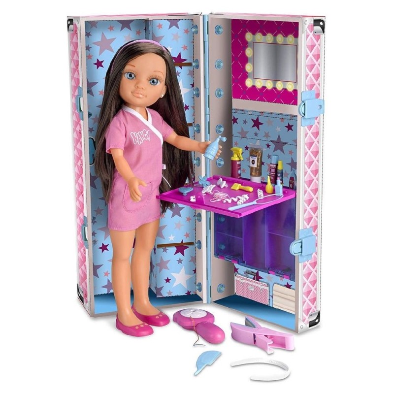 Nancy y mi maletín de peinados es el maletín más completo de belleza y peinados que puedas imaginar. Con Nancy de pelo oscuro. Cuando abres el maletín, cuenta con todo lo necesario para hacer los peinados mas increíbles a Nancy: planchas del pelo, supertrenzador, mechas de purpurina, peines y accesorios de belleza. Además, tiene un tocador con espejo y mesita plegable. Como es plegable, lo puedes cerrar y llevar a Nancy y todos sus complementos a cualquier lado. Edad recomendada: a partir de 3 años.