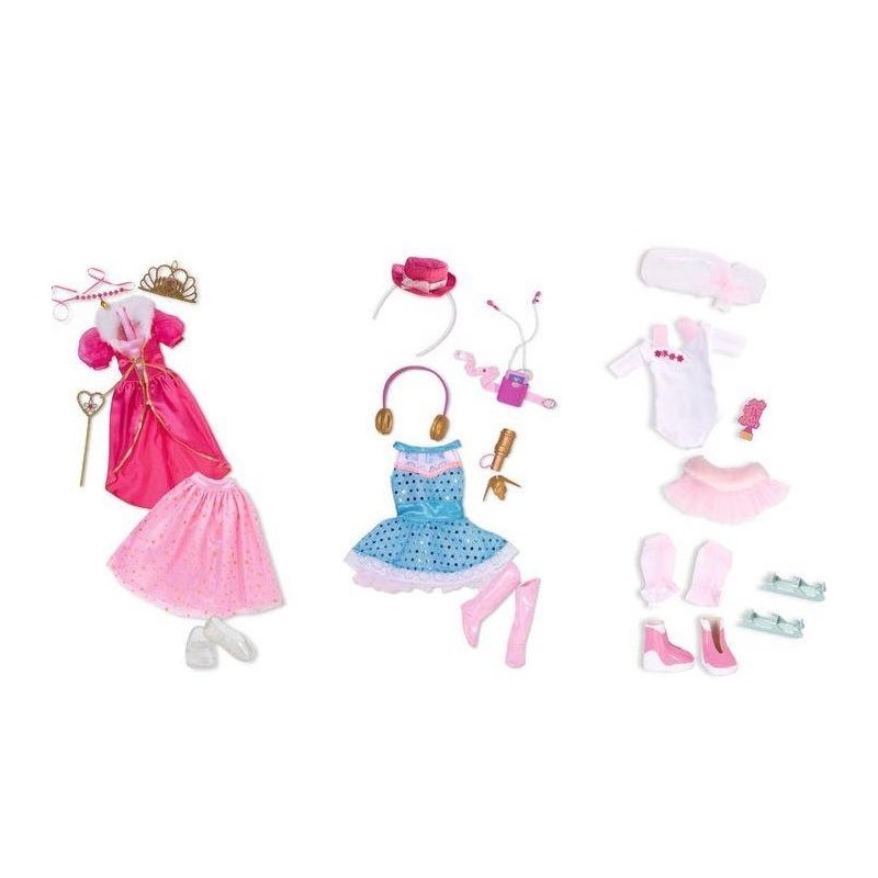 Conjunto de 3 preciosos vestidos de ensueño para vestir a tu Nancy como tú deseas: de cantante super moderna con los accesorios más increíbles; de princesa de ensueño con un vestido único y espectacular; y de patinadora de invierno con unos complementos super cool.. Edad recomendada: a partir de 3 años.