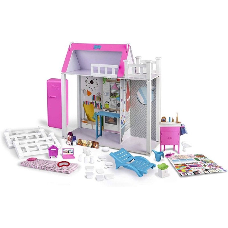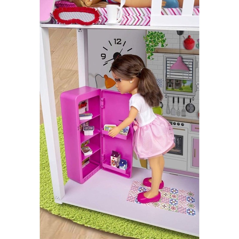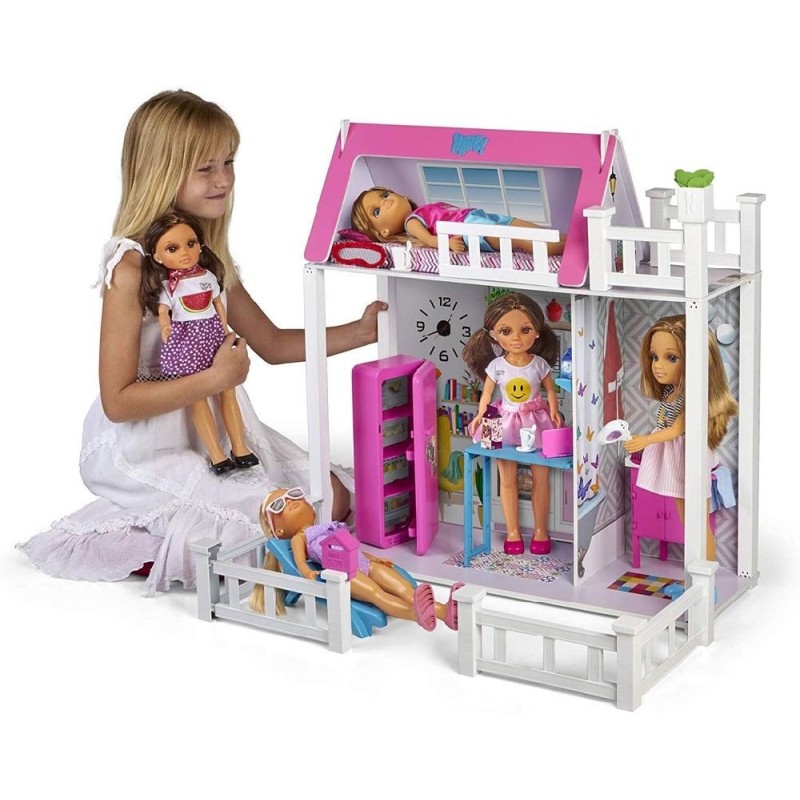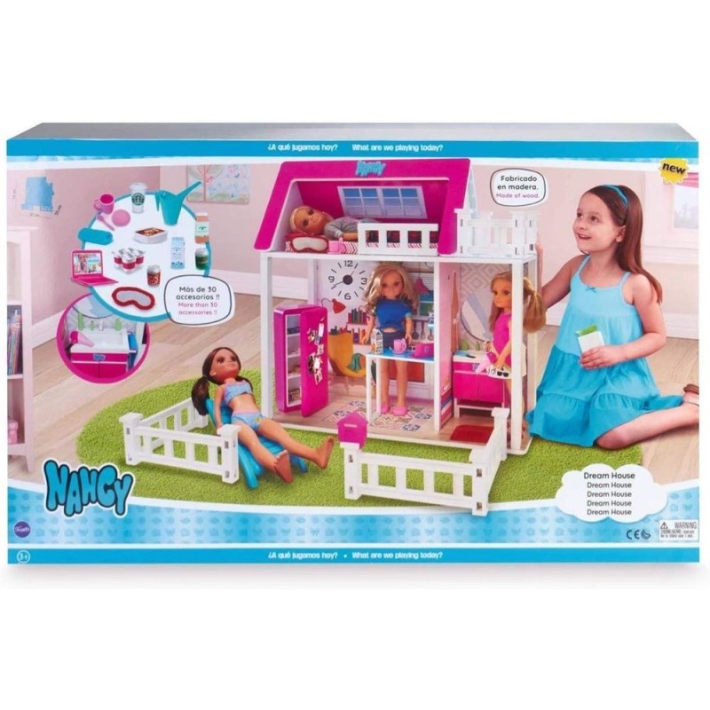 Nancy, Sweet Home, es la casa de Nancy con la que toda niña ha soñado. Es una bonita casa de madera blanca que tiene dos pisos. En la parte superior encontrarán una habitación dormitorio super bonita con una cama de suelo con almohada. En la parte de abajo esta el baño y la cocina llena de accesorios. Además, tiene un jardín con una valla de madera blanca y una hamaca para tomar el sol. Incluye todo lo necesario para vivir con Nancy las historias más increíbles. Edad recomendada: +3 años.