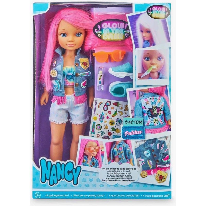 Nancy va vestida con ropa muy moderna: una cazadora vaquera con dibujos, unos shorts y un crop top tye dye y unas sneackers con plataforma El pack tiene además un montón de pegatinas diferentes para personalizar su ropa o lo que tu peque más quiera Además contiene 2 accesorios súper chulos: unas gafas naranjas y un pintalabios, para pintar sobre la muñeca, que también brilla en la oscuridad. Edad recomendada: +3 años.