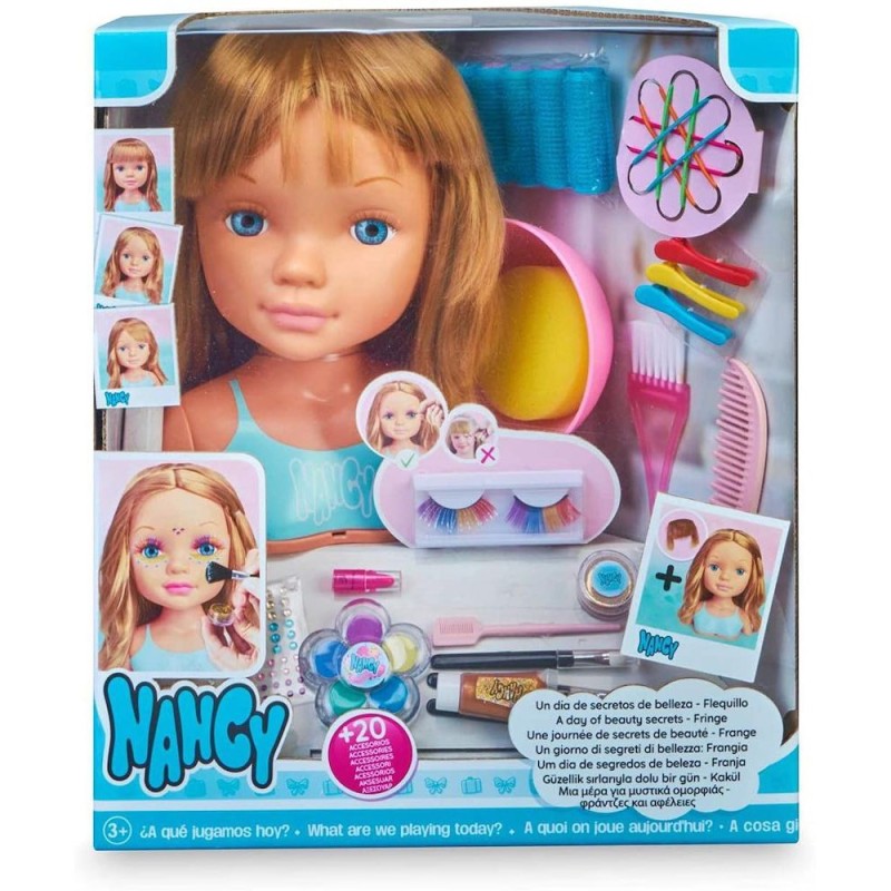 Nancy, Un día de Secretos de Belleza con Flequillo (700016638) es el busto clásico de Nancy en versión castaña y con flequillo postizo. Nancy tiene el pelo de castaño claro y muy largo para hacerle muchos peinados originales y como un estilista de verdad. Además, Nancy tiene la cara adecuada y adaptada para maquillarla de mil maneras diferentes y ser súper creativo, como un/a maquillador/a profesional. Un busto para maquillas y peinar súper bonito, de la clásica muñeca Nancy, que todos los niños y niñas adorarán para poder jugar y practicar para luego poder hacerse los peinados a ellos mismos. Incluye muchos accesorios diferentes para jugar con ella y decorarle el pelo, como gomas de pelo, pinzas de colores, la extensión del flequillo de su color, peines y rulos para hacerle rizos en el pelo, trenzas y recogidos y utensilios para ‘teñir el pelo’; Además incluye otros elementos para hacerle looks increíbles en la cara, como brochas de maquillaje y un bote de maquillaje, sombras de colores, purpurina brillante de colorines y un pintalabios. También hay pestañas postizas extra largas de los colores del arcoíris y pegatinas para hacerle un look más de fantasía, como de festival. ¡Llévate el salón a casa y aprende con Nancy cómo ser la mejor peluquera y maquilladora! Edad recomendada: +3 años.