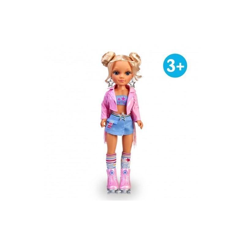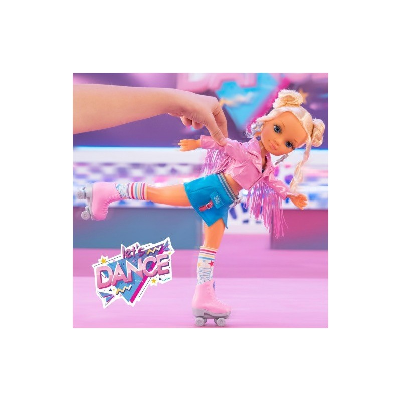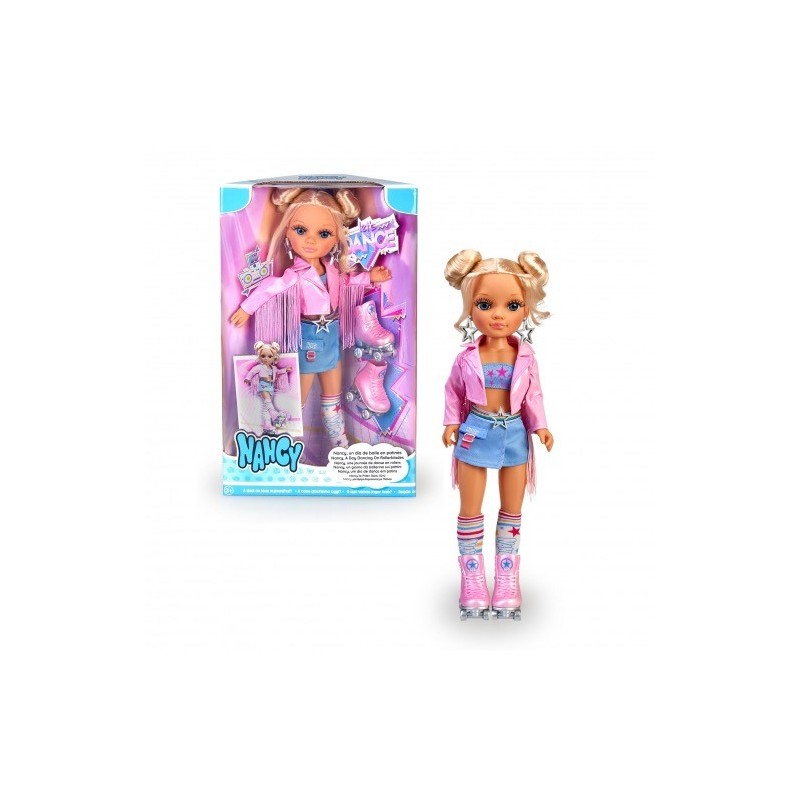 Nancy, un día de baile en patines. Patina y baila al ritmo de la música en la fiesta sobre ruedas de Nancy. Con sus patines hará movimientos increíbles mientras deja a todos boquiabiertos con su look : una chaqueta rosa de flecos a juego con sus patines, un top y una falda súper trendy y unos calcetines altos hasta las rodillas. Además, su peinado de dos moños altos le permite lucir sus grandes pendientes en forma de estrella con los que destacará sobre la pista. ¡Patina con Nancy, crea divertidas y originales coreografías y sé la reina o el rey de la fiesta!