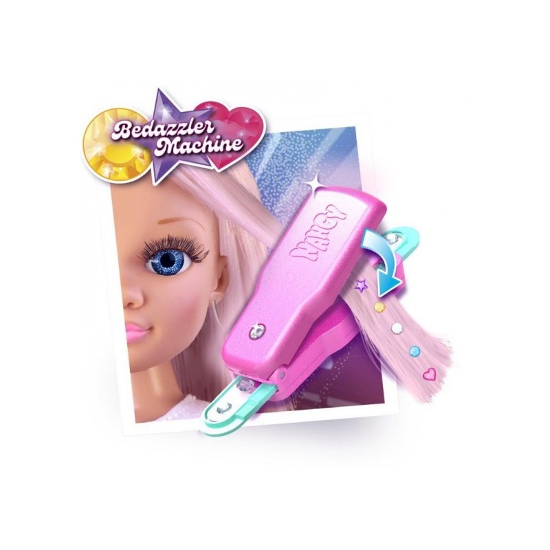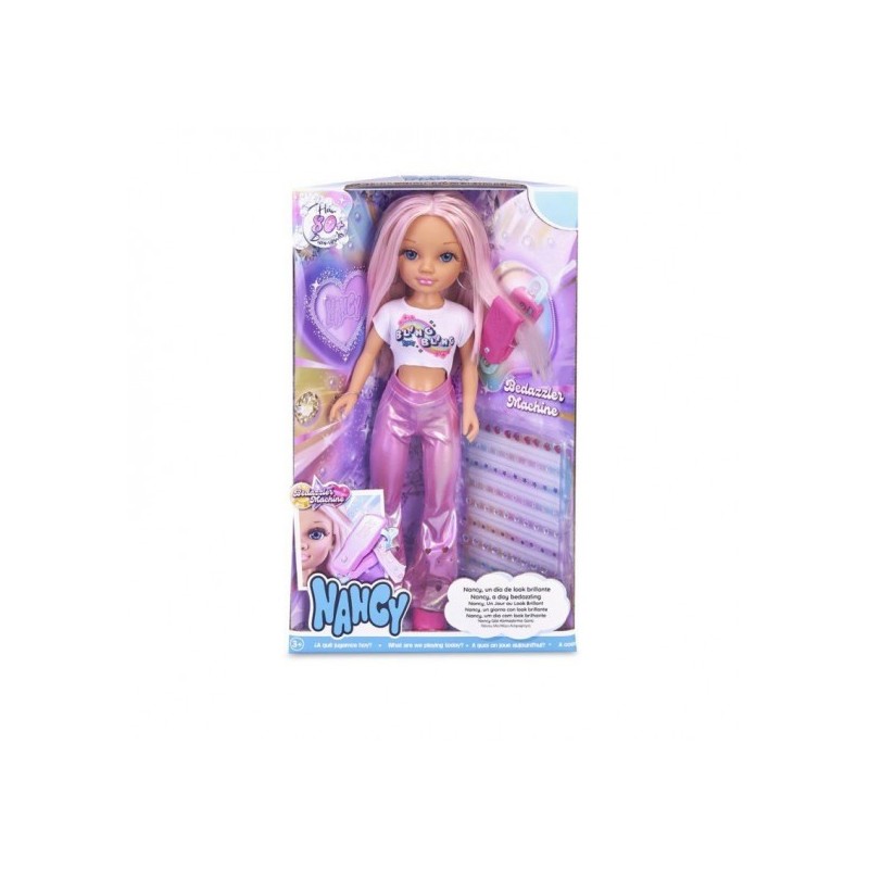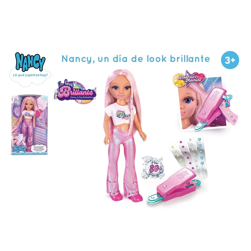 Nancy, un día de look brillante te permite decorar el pelo de Nancy creando infinitos diseños. Incluye máquina de gemas y más de 100 accesorios para decorar tu propio pelo y el de Nancy. Nancy lleva pantalones metalizados troquelados, zapatos rosas a juego y labios con decoración metálica. Edad recomendada: +3 años.