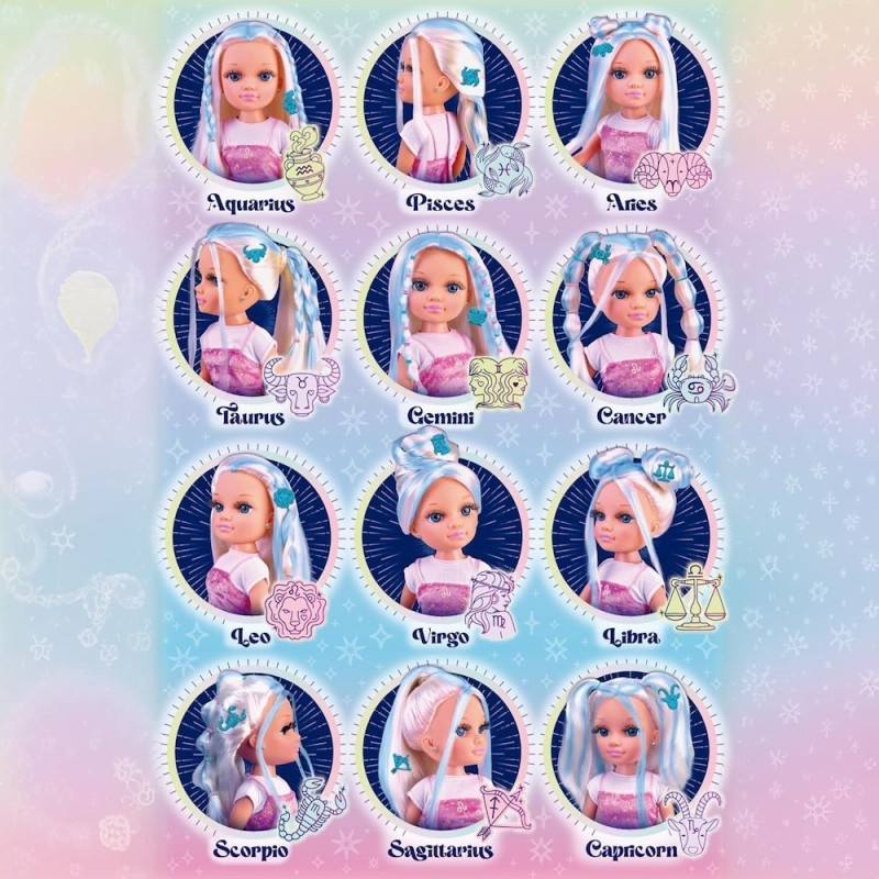 Edad recomendada: +3 años. Nancy lleva un vestido rosa corto estampado inspirado en los signos del zodiaco que brillan en la oscuridad. Nancy lleva el pelo largo con mechas en tonos azules con un semirrecogido en moño alto. Incluye accesorios que brillan en la oscuridad para crear peinados inspirados en el horóscopo. Es la muñeca óptima para desarrollar la creatividad y el juego imaginativo de las pequeñas mientras crean peinados óptimos Nancy mide 42cm de altura, lo que la convierte en una compañera óptima para jugar y peinar.