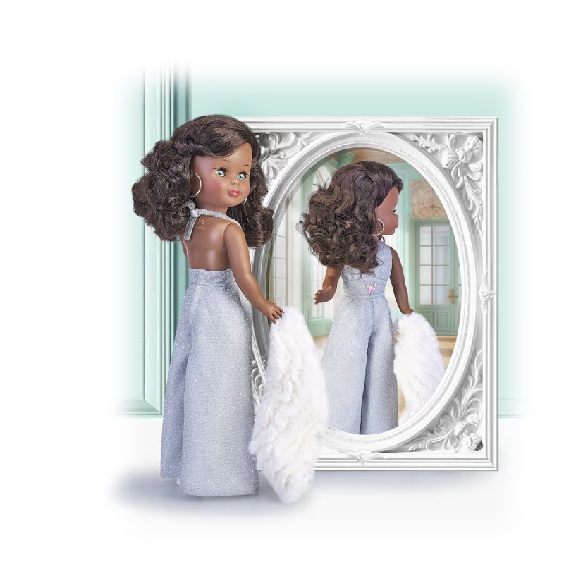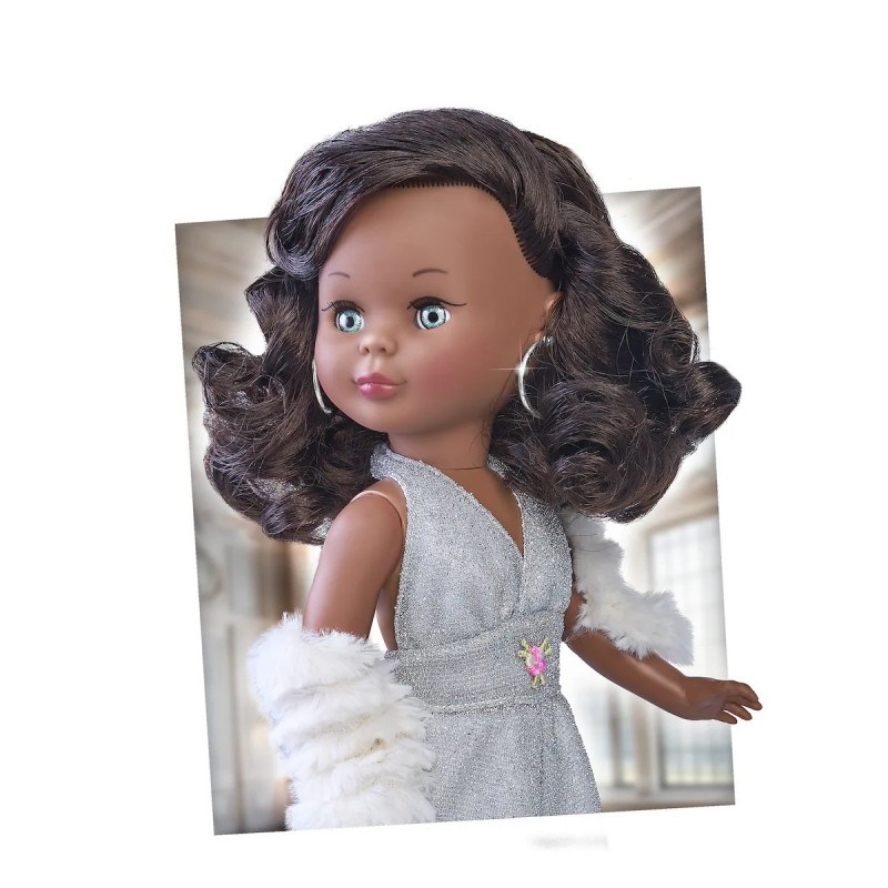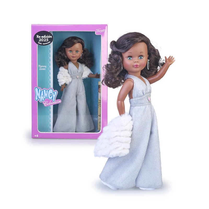 Nancy Colección Liceo viste un conjunto que es una reedición del modelo original de 1977. La muñeca viste un mono plateado largo de pata de elefante anudado al cuello dejando su espalda al descubierto, adornado con una flor en la cintura. El look se complementa con un chal blanco de efecto visón. Además, Nancy Colección Liceo luce una media melena ondulada de color marrón oscuro.