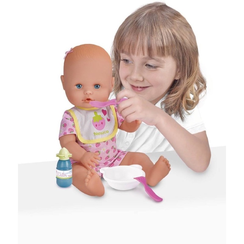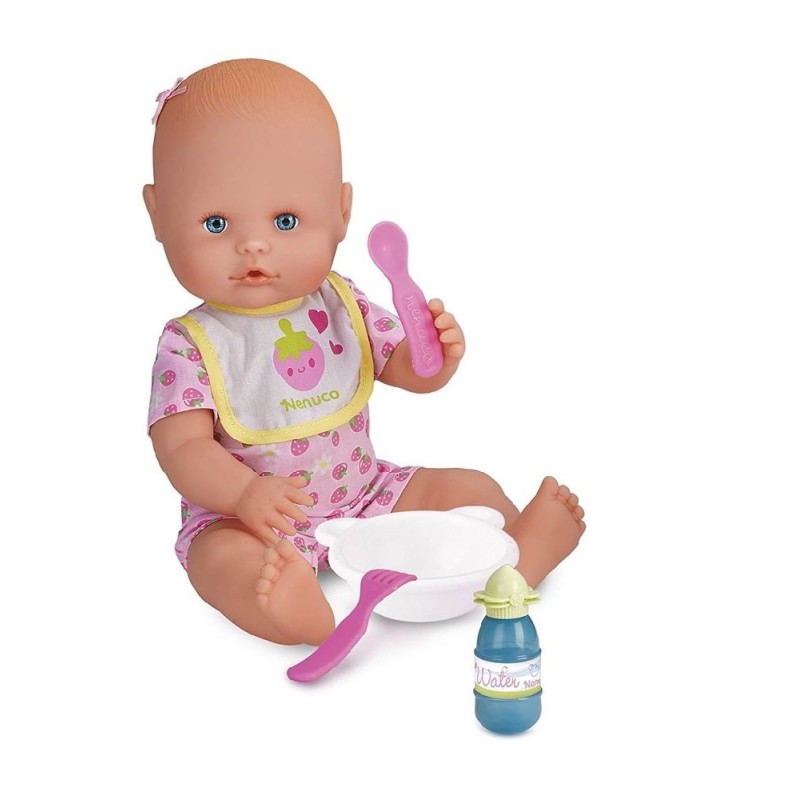Este Nenuco de 35 cm. viene con muchos accesorios para que le des de comer: plato, cuchara, tenedor y biberón. Edad recomendada: a partir de 1 año.