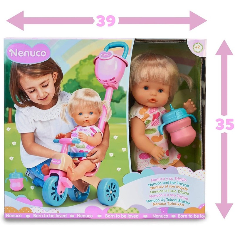 Nenuco y su triciclo es un set de juguete muy completo, para llevar siempre contigo a tu muñeca y jugar con ella en cualquier lado. Un juguete con muchos detalles y algunos accesorios para completar la experiencia de juego y que sea más divertida. El pack incluye una muñeca Nenuco con el pelito rubio, que lleva peinado en 2 coletas pequeñas. El triciclo donde se coloca a Nenuco sentadita es muy bonito. Tiene un bonito diseño en colores pastel: rosa, amarillo y azul. Cuenta con un mango con asa adaptado a la altura de los niños y niñas de entre 3 y 5 años de edad. En el cual se coloca una pequeña cesta extraíble para guardar y llevarte todo lo que puedas necesitar, como el pañal y el biberón que vienen incluidos.