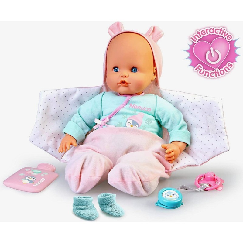 ¿Nenuco tiene frio… o calor? Controla la temperatura de Nenuco!! Si Nenuco tiene frio empezará a temblar… oh no! Tenemos que hacer que entre en calor! Mete a Nenuco en su saquito, ponle los patucos y la bolsita de agua caliente. Listo! Pero… oh no! Ahora la frente de Nenuco se ha puesto rojita, tiene mucho calor! Debemos regular de nuevo su temperatura quitándole la ropita. ¡Juega una y otra vez a abrigarle hasta que se le ponga rojita la frente, y a quitársela hasta que empiece a temblar! Edad recomendada: +2 años.
