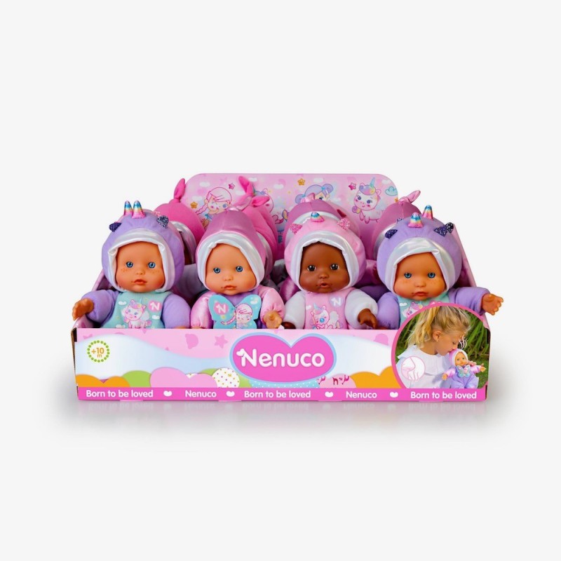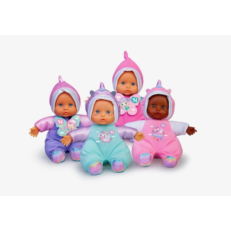 Nenucos de 15 cm vestidos con ropita con motivos de fantasía. 4 modelos diferentes con ropita en colores pastel decorada con unicornios y hadas. Ahora tienen el mismo aroma que los Nenucos de mayor tamaño. Edad recomendada: +2 años.