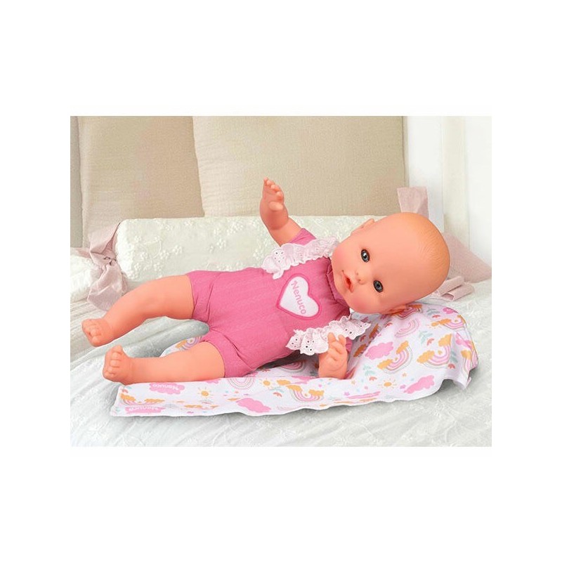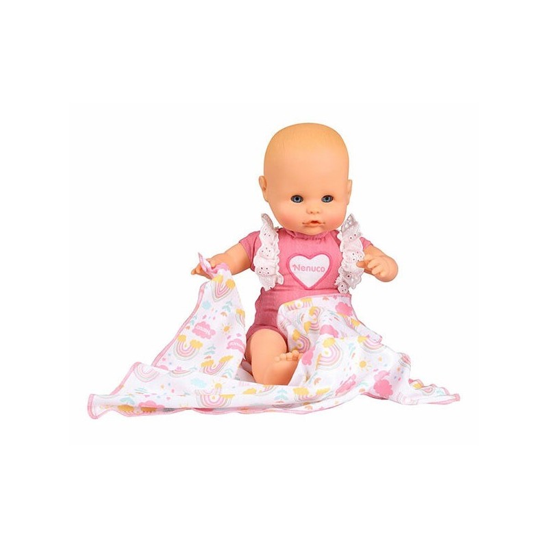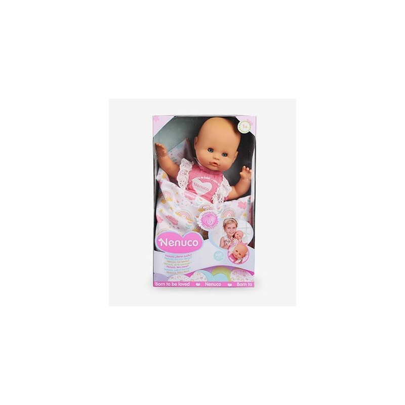 Edad recomendada: +1 año. Nenuco, ¿tienes sueño? Nenuco blandito que al presionarle la tripita emite sonidos de bebé, incluye una mantita para acostarle. Muñeco con ojos durmientes. Con sonidos.