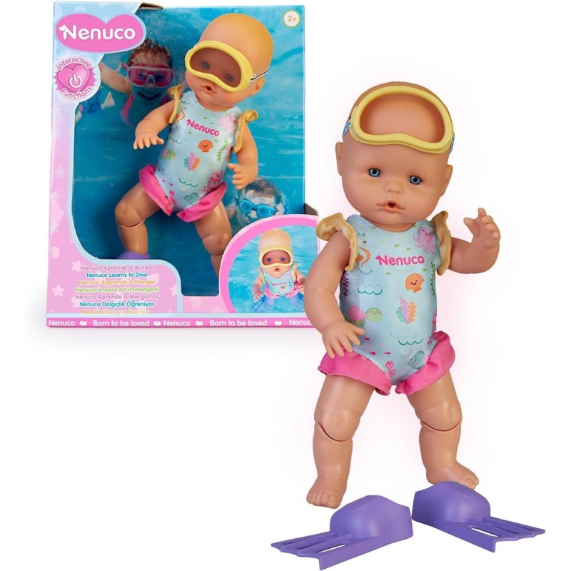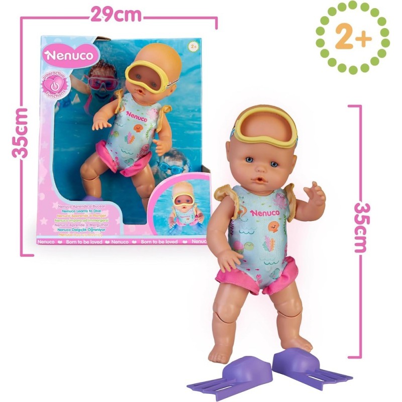 Edad recomendada: +2 años. Nenuco mecánico de 35 cm y cuerpo duro. Puede nadar solo y usarse tanto en piscina como en la bañera. Lleva un precioso traje de baño con dibujitos de colores. Incluye aletas y gafas de bucear. Necesita pilas.