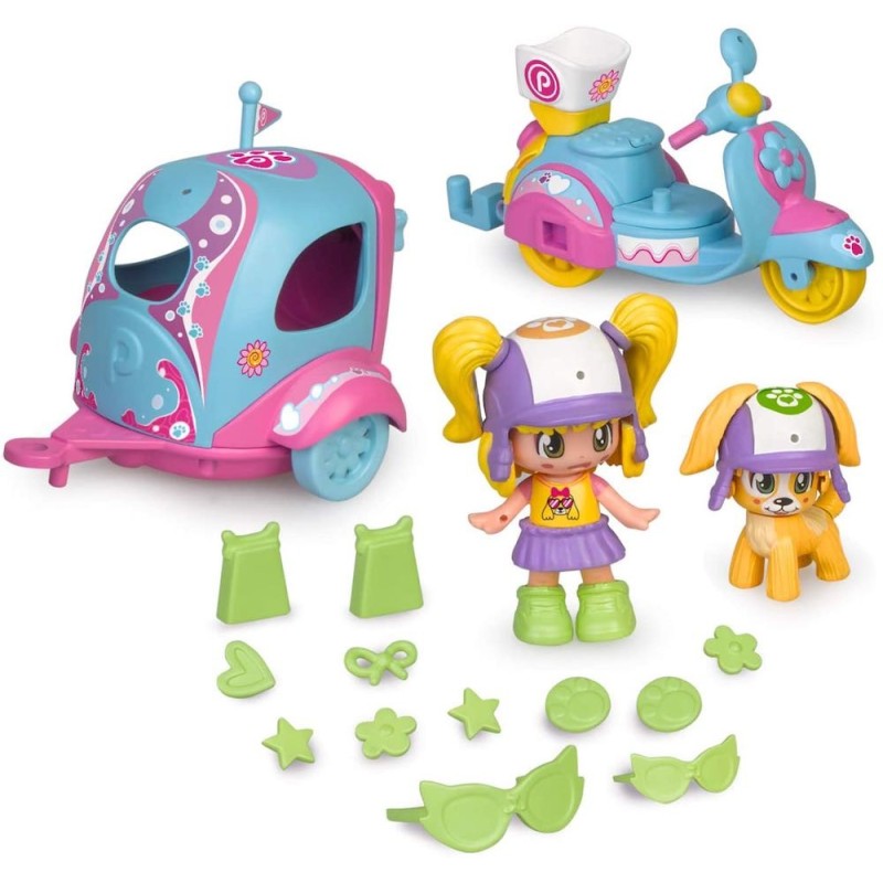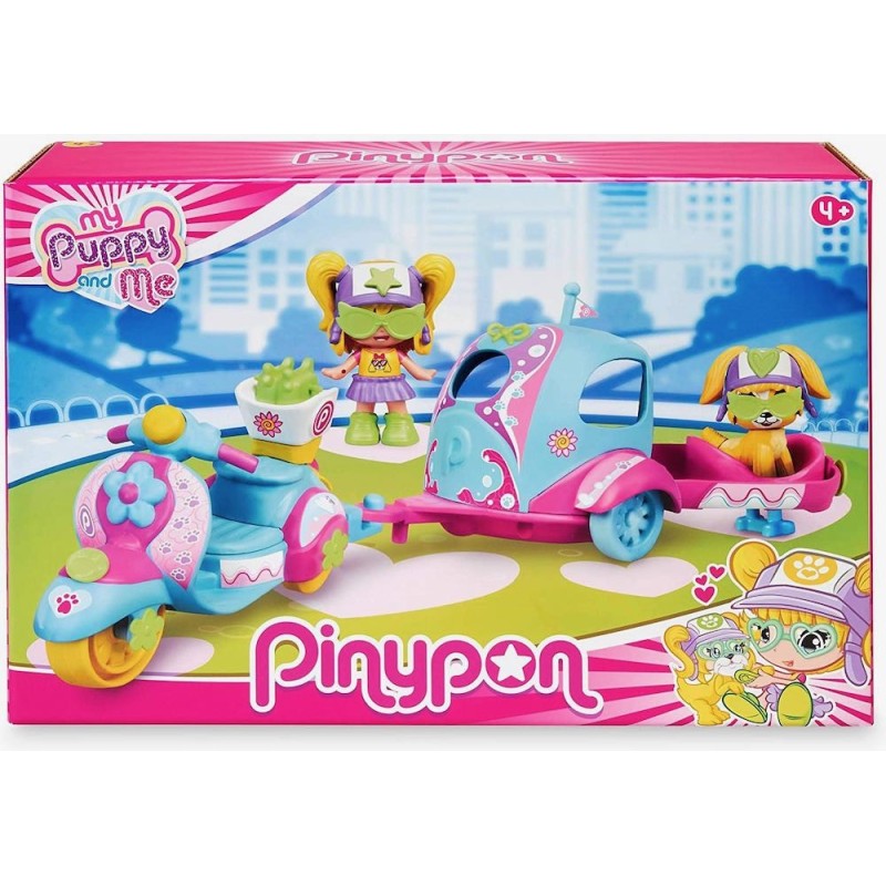 Pinypon. My Puppy& Me. Moto con remolque. Set de moto, remolque, 1 figura Pinypon y 1 figura de cachorro. Remolque con compartimento para guardar los accesorios. El cachorro se parece mucho a su dueña; los dos llevan el mismo peinado, casco y gafas. Los pelos de las 2 figuras son intercambiables. Edad recomendada: +4 años.