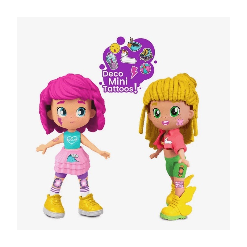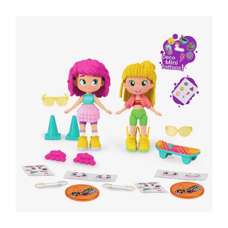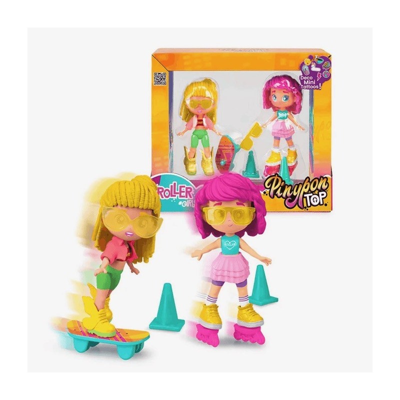 Descubre el set Pinypon Top Roller Girls, con dos muñecas de 11 cm, patines, skateboard y accesorios. ¡Personaliza y crea historias llenas de acción! Patinaje y acrobacias sobre ruedas: Las Pinypon Top Roller Girls están listas para deslizarse con estilo. Una muñeca lleva patines de colores vibrantes y la otra domina el skateboard. Personalización única: Decora a tus muñecas con los stickers incluidos y combina su ropa, cabello y accesorios para crear looks únicos y llenos de personalidad.