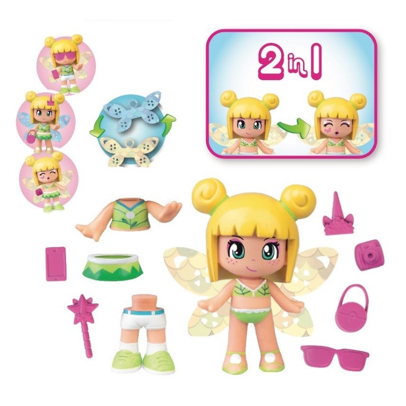 Figura de Hada Mágica con alas reversibles decoradas con purpurina por las 2 caras: dorada y azul. Incluyen piezas intercambiables con temática de verano y accesorios.