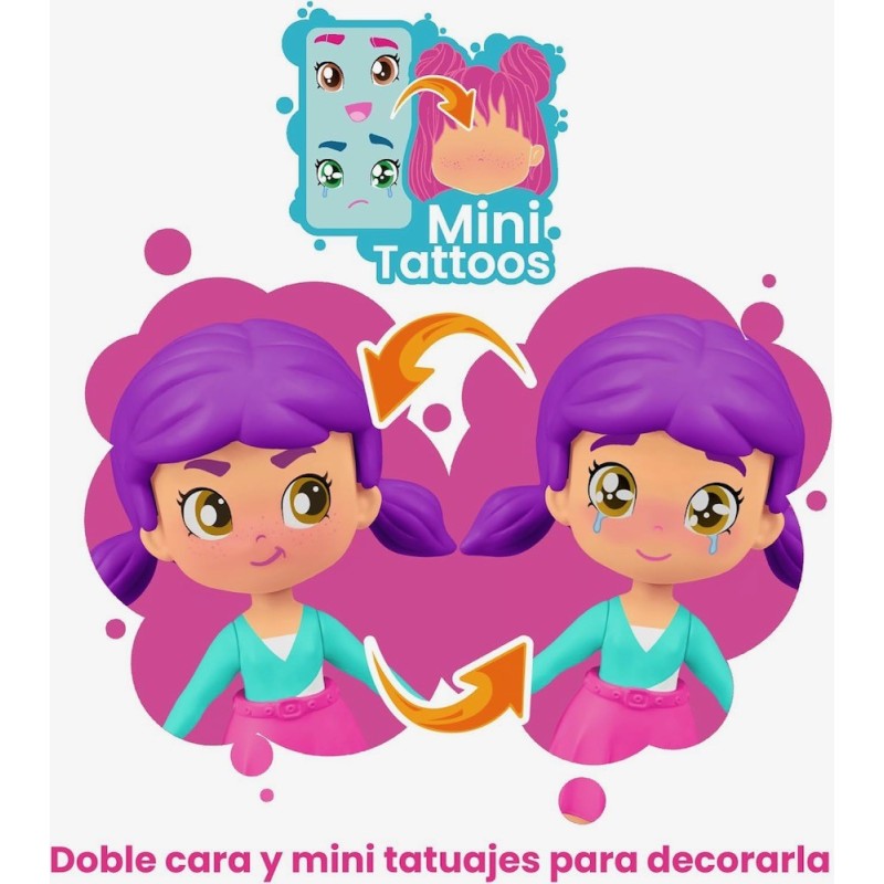 Surtido de 4 chicas Pinypon TOP vestidas con diferentes outfits de Street Style. La figura mide 11cm y es articulada de brazos y piernas. Tiene doble cara con mini tatuajes para decorar la cara. Lleva ropa y zapatos intercambiables. Existen diferentes modelos. Se venden por separado. Se surtirán según existencias.
