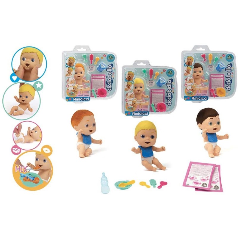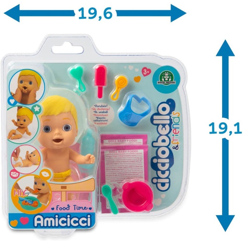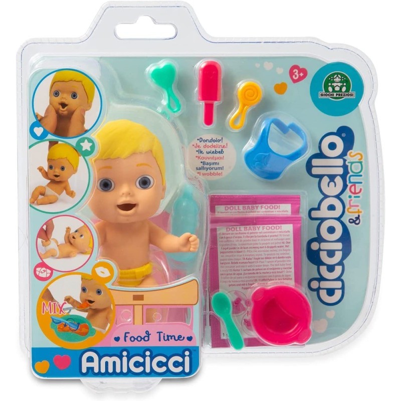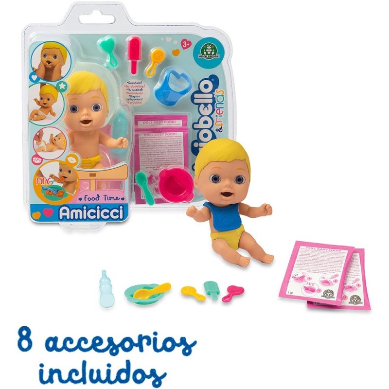 Descubre los Cicciobello Amicicci, pequeños bebés flexibles que se comportan como los bebés de verdad. Hacen movimientos del cuerpo increíbles, llenos de expresión facial. ¡Es hora de comer! Prepara su comida mezclando las bolsas de polvo con agua y dale a comer con los accesorios. El paquete incluye: 1 Cicciobello Amicicci, 1 pañal extraíble, 2 bolsas de comida para bebé (1 g cada uno) y 7 mini accesorios. Edad recomendada: +3 años.