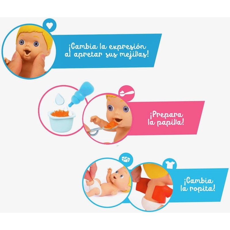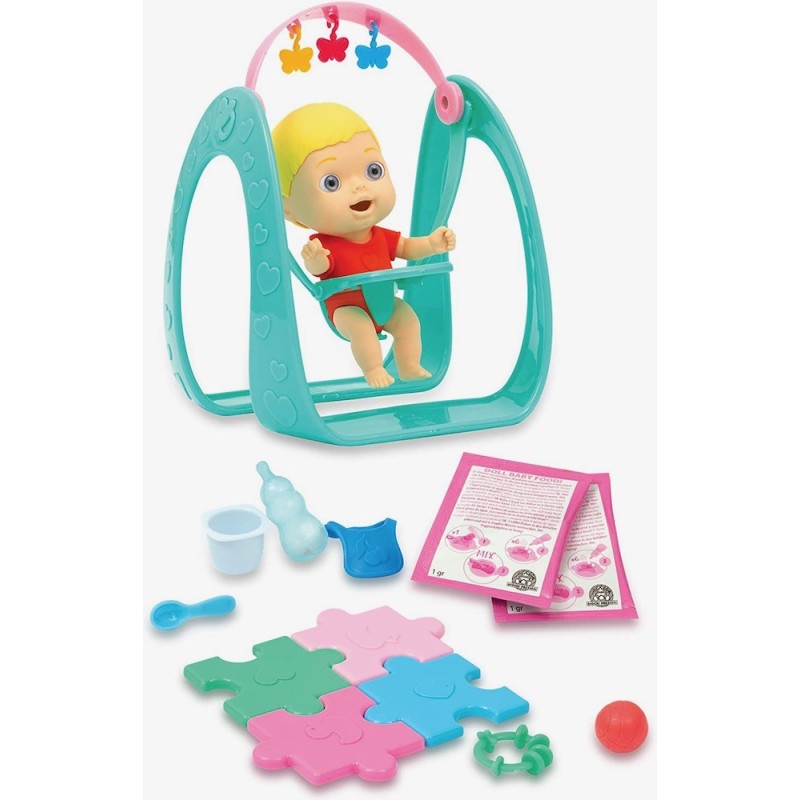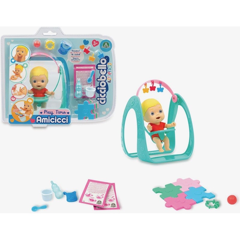 Amicicci son pequeños bebés flexibles hechos con un material blandito. Amicicci se puede comportar como un bebé de verdad con movimientos y con muchas expresiones faciales. Pueden meterse la mano o el pie en la boquita y tomarse su piruleta. Además su pañal se puede quitar y poner. Hay diferentes personajes para coleccionar. Incluye varios accesorios de comidas, de juegos y el balancín. Edad recomenddada: +3 años.