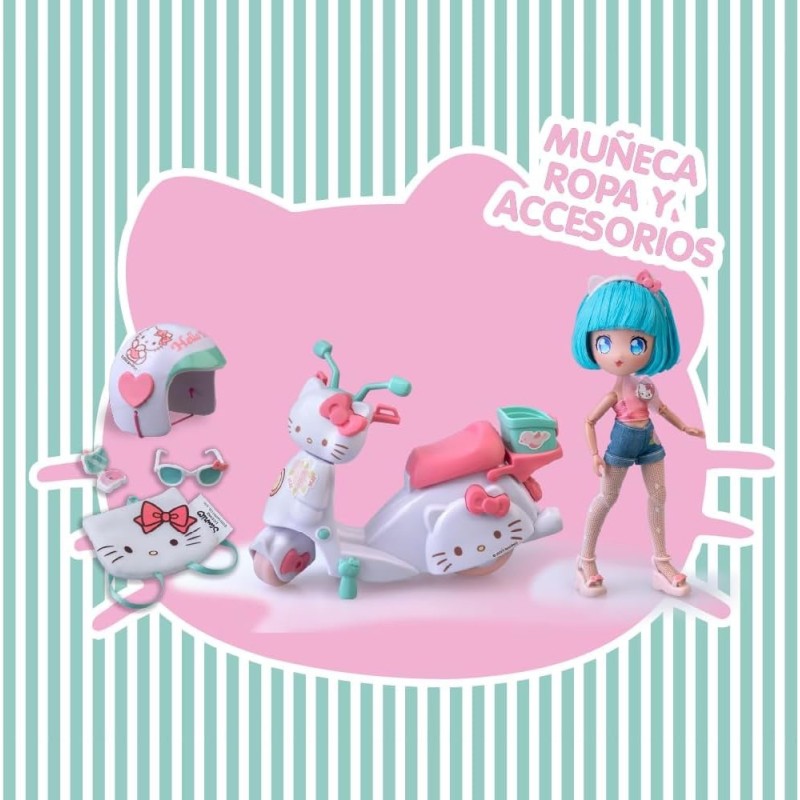 Edad recomendada: +3 años. Muñeca Fashion Japonesa con Moto y Accesorios. Figura de 19.5 cm con 15 Puntos de Articulación. Incluye Casco y Bolso. Viste un Top con Microshorts. Este set incluye una muñeca Fashion Japonesa de Hello Kitty y su scooter de diseño inspirado en el icónico personaje; optimo para recorrer mundos imaginarios con estilo, cada detalle captura la esencia kawaii. La muñeca de 19.5 cm luce el encantador look Pretty Pink, con un top decorado con la cara de Hello Kitty, microshorts modernos y una adorable diadema con orejas que refuerzan su estilo encantador. Con 15 puntos de articulación, la figura permite adoptar múltiples posturas, desde montar su scooter hasta posar en escenarios creativos; su flexibilidad añade una dimensión extra al juego.
