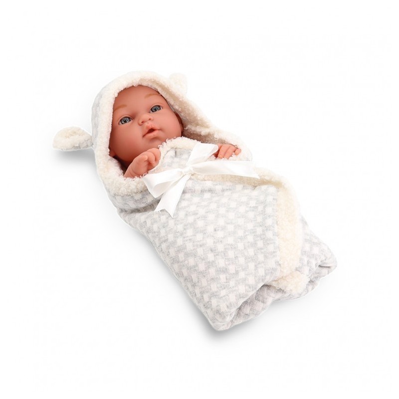Edad recomendada: +3 años. Bebé 30 cm con capa de arrullo. Se trata de un bebé único ya que el molde es propio y por lo tanto exclusivo. El objetivo era crear un bebé con facciones muy realista, ojos claros, tez morena, pero, sobre todo. de una calidad exquisita. Este pequeño bebé es un regalo perfecto para todos aquellos niños o niñas que tienen pasión por cuidar a los más pequeños y desean tener un hermanito.