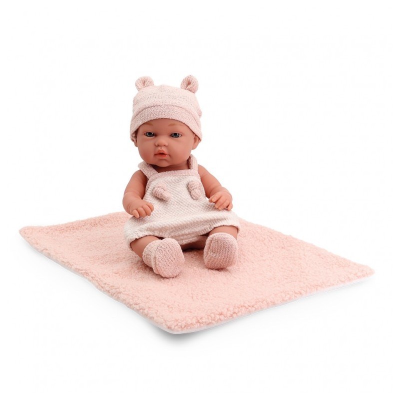 Edad recomendad: +3 años. Bebé 30 cm con conjunto de punto: gorrito, peto y botitas. Se trata de un bebé único ya que el molde es propio y por lo tanto exclusivo. El objetivo era crear un bebé con facciones muy realista, ojos claros, tez morena, pero, sobre todo, de una calidad exquisita. Este pequeño bebé es un regalo perfecto para todos aquellos niños o niñas que tienen pasión por cuidar a los más pequeños y desean tener un hermanito. Incluye una mantita para que él bebe no pase frio.